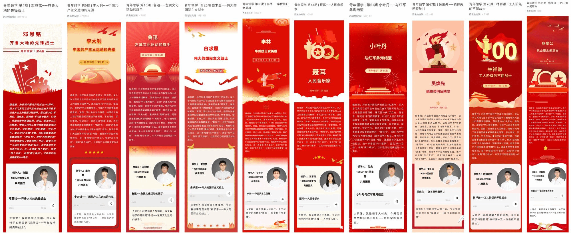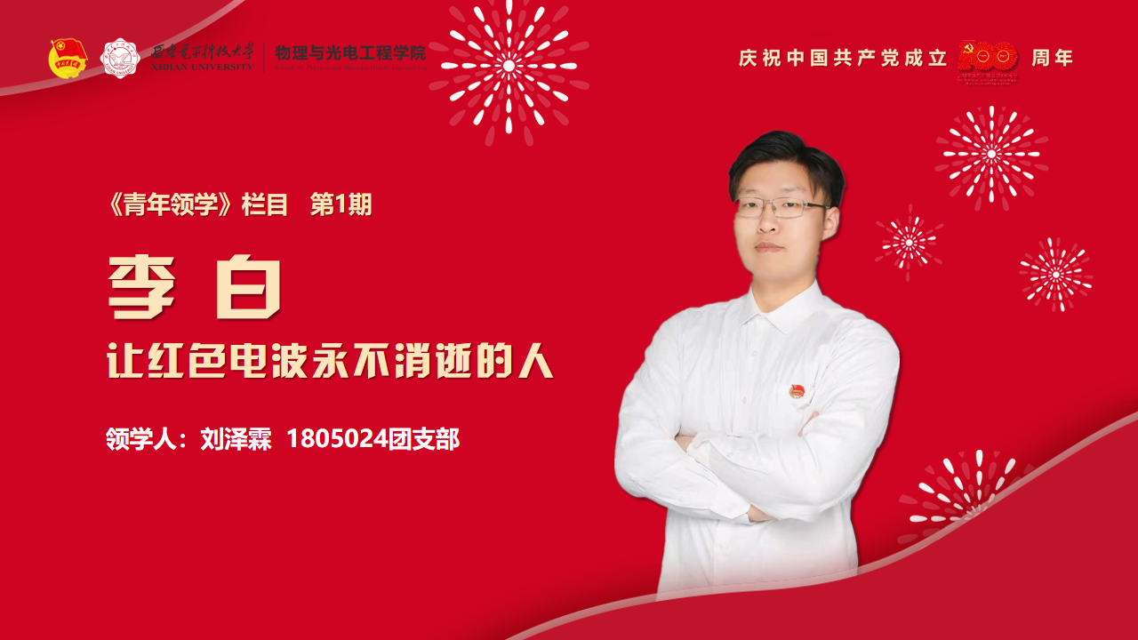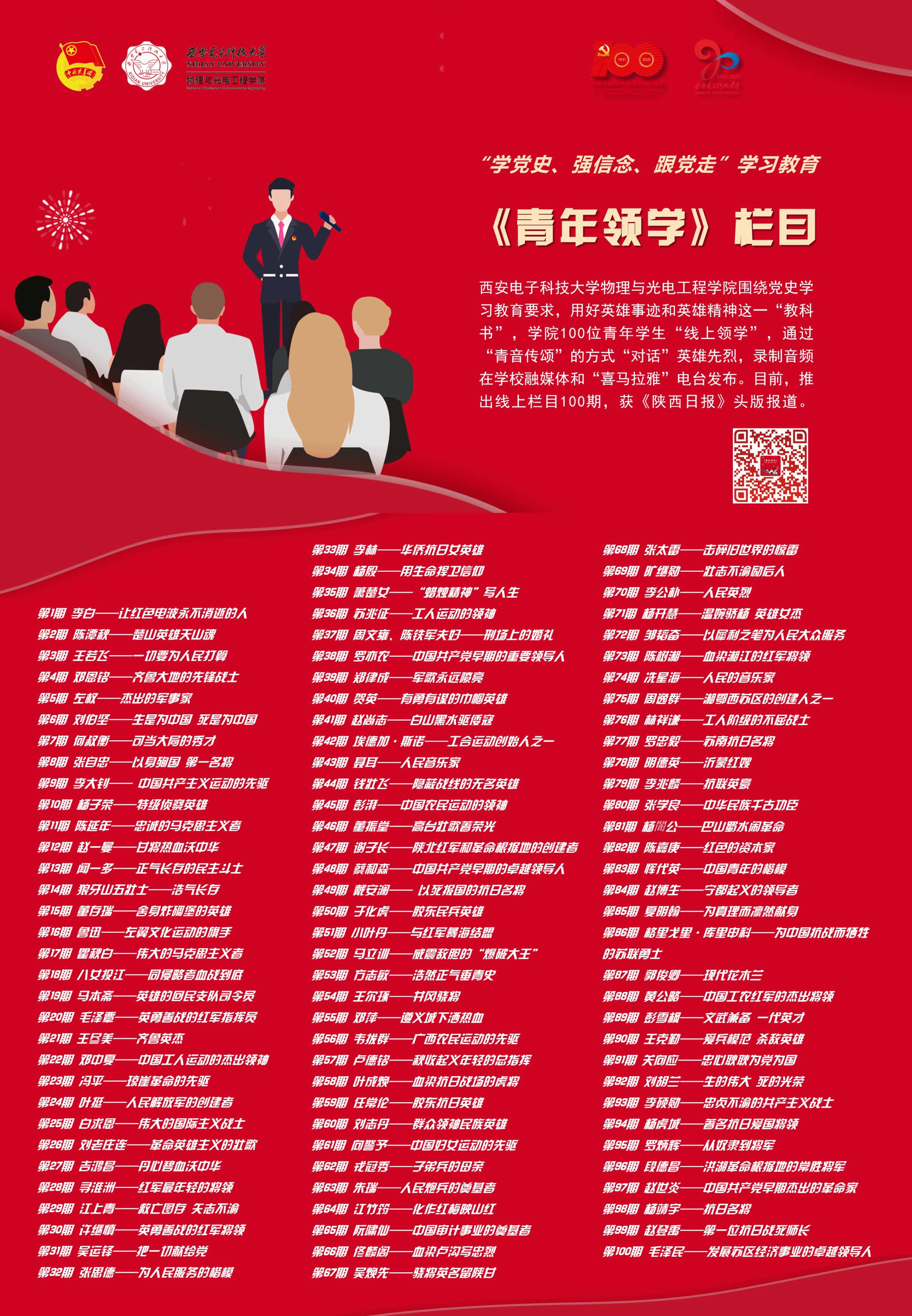 编者按:为庆祝中国共产党成立100周年,深入学习贯彻习近平总书记在党史学习教育动员大会上的重要讲话精神,落实团中央“学党史、强信念、跟党走”学习教育要求,引领广大团员青年厚植爱党、爱国、爱社会主义的情感,物理与光电工程学院紧紧围绕学史明理、学史增信、学史崇德、学史力行,重点突出“英雄”主题,用好英雄事迹和英雄精神这一“教科书”,依托“西电物光院”官方微信和“喜马拉雅FM”电台推出《青年领学》栏目,教育引导广大青年同“英雄”对话,激发青年学生的责任担当,进一步增强“四个意识”、坚定“四个自信”、做到“两个维护”,以实际行动迎接建党100周年。