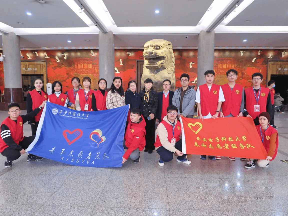 仪式结束后,学院春雨志愿者服务队与馆长侯宁彬等合影留念。李维嘉同西安外国语大学志愿者服务队指导教师曲晶晶、陕历博志愿组工作人员高英喆交流志愿服务工作经验,对新一年志愿服务工作计划要求提出意见,同时期待西电与西外两校志愿者们能继续加强联系、共同合作,为国家社会贡献青春力量。