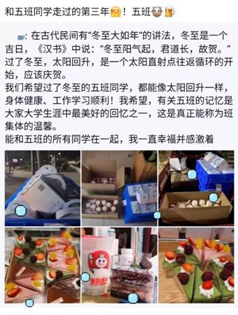 (通讯员:高原 程睿)冬至是我国农历中一个重要的节气,也是中华民族的传统节日,在古代民间有“冬至大如年”的讲法。然而2021年冬至正值期末备考复习关键时期,且西安市疫情形势陡增严峻。在这种环境下,同学们难免会有压力、有紧张焦虑的情绪。为了给忙碌中的同学们加加油、鼓鼓劲,缓解同学们的压力、增强班级凝聚力,物理与光电工程学院积极动员学生党员、入党积极分子、学生干部以多种方式自发给同学们送去温暖和关爱。