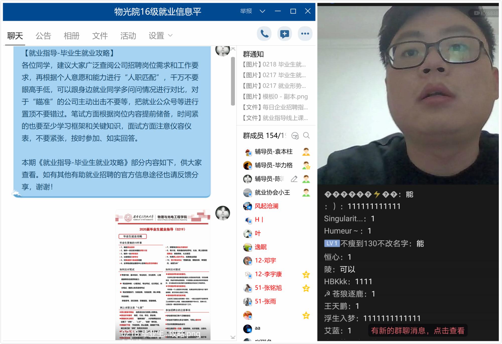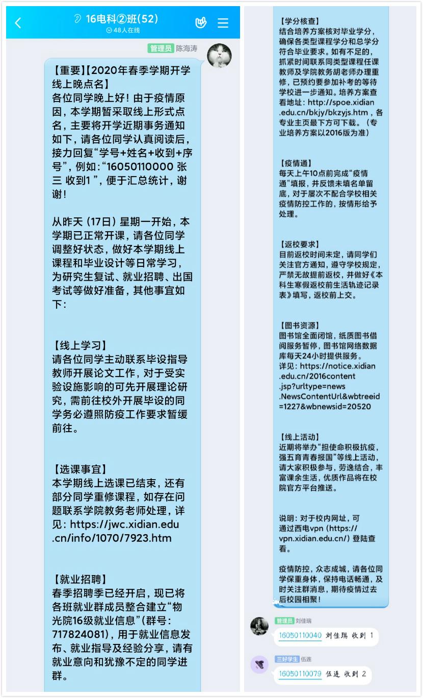 学院各年级通过不同平台,组织了线上“晚点名”,开展抗“疫”教育与开学动员教育工作。各年级辅导员通过分析了当前疫情形势、带来的挑战和对大家的要求,鼓励大家调整好个人状态,为新学期明确目标,完成好学业任务。2020新学期的“云”点名为大家开启了一个难以忘怀的新学期,大家也纷纷表示,开学“晚点名”后会以一个新的状态来应对这个难忘的学期。