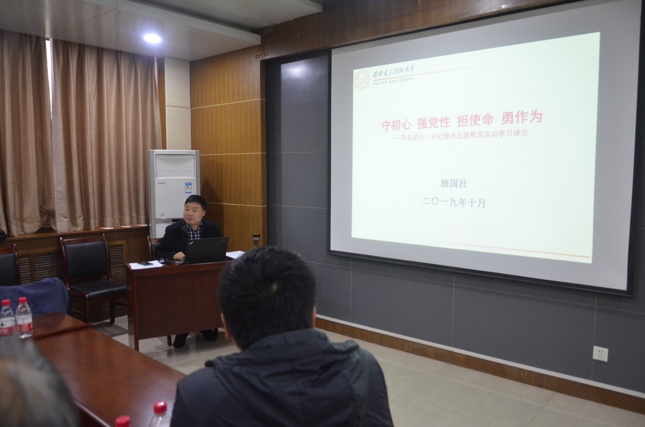 10月22日下午,在北校区西大楼412报告厅,物理与光电工程学院党委举行“不忘初心、牢记使命”主题教育专题党课,学院党委书记独国社、执行院长邵晓鹏主讲,学院两委委员、组织员、系所负责人、教工党支部书记、各党支部党员代表等参加听课,学校主题教育指导组成员宁静参加指导。