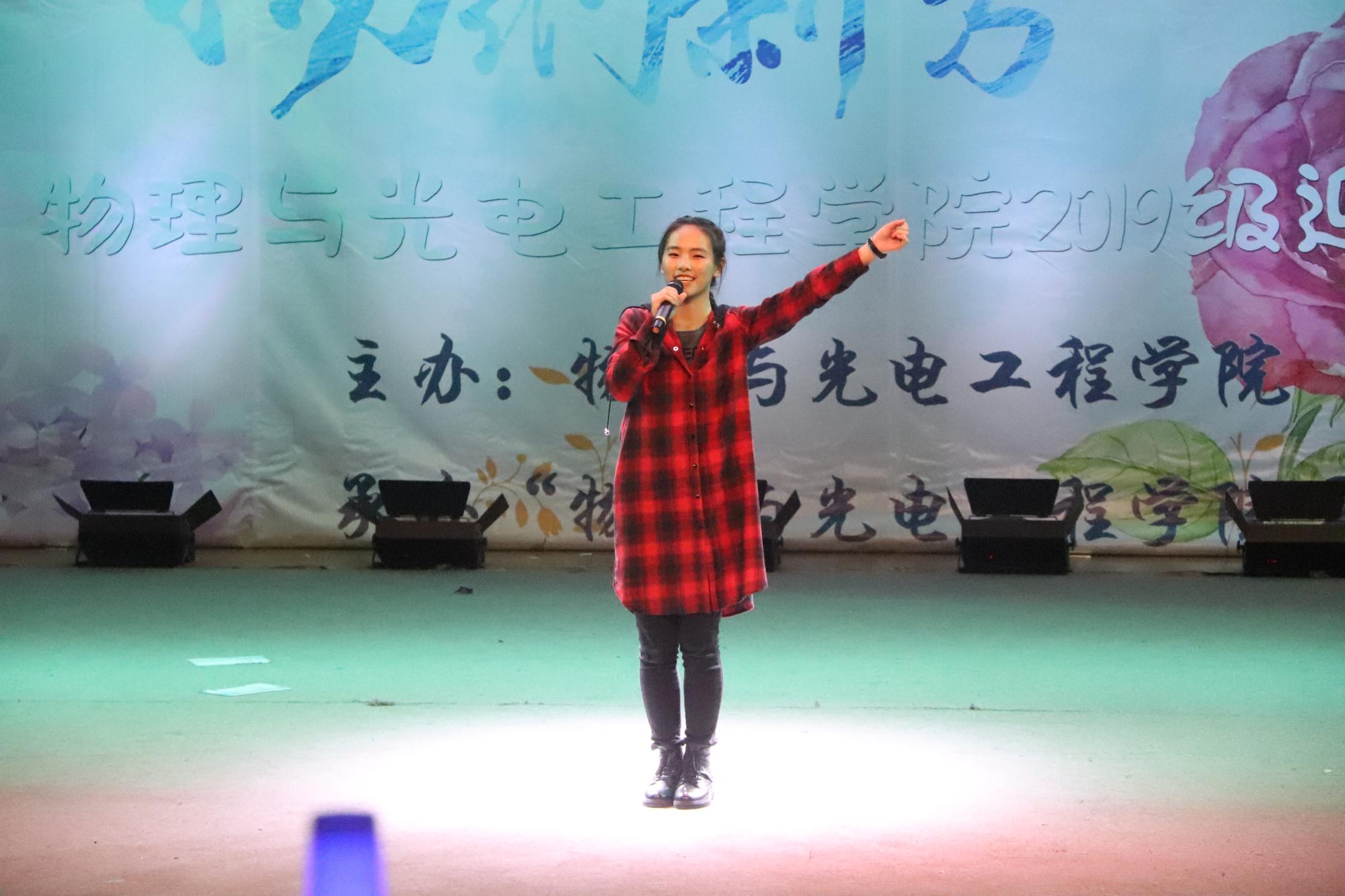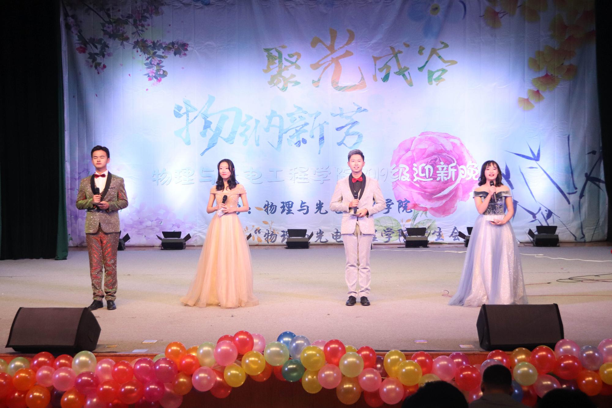 (通讯员:曹欣怡 刘超)11月10晚六时,物理与光电工程学院“聚光成谷,物纳新芳”2019级迎新晚会在南校区大学生活动中心小剧场举行。学院党委书记独国社、执行院长邵晓鹏、组织员陈峰、党委副书记林波、副院长辛红、各年级辅导员、专任教师以及全体2019级本科生欢聚一堂,共同欣赏这场视听盛宴。