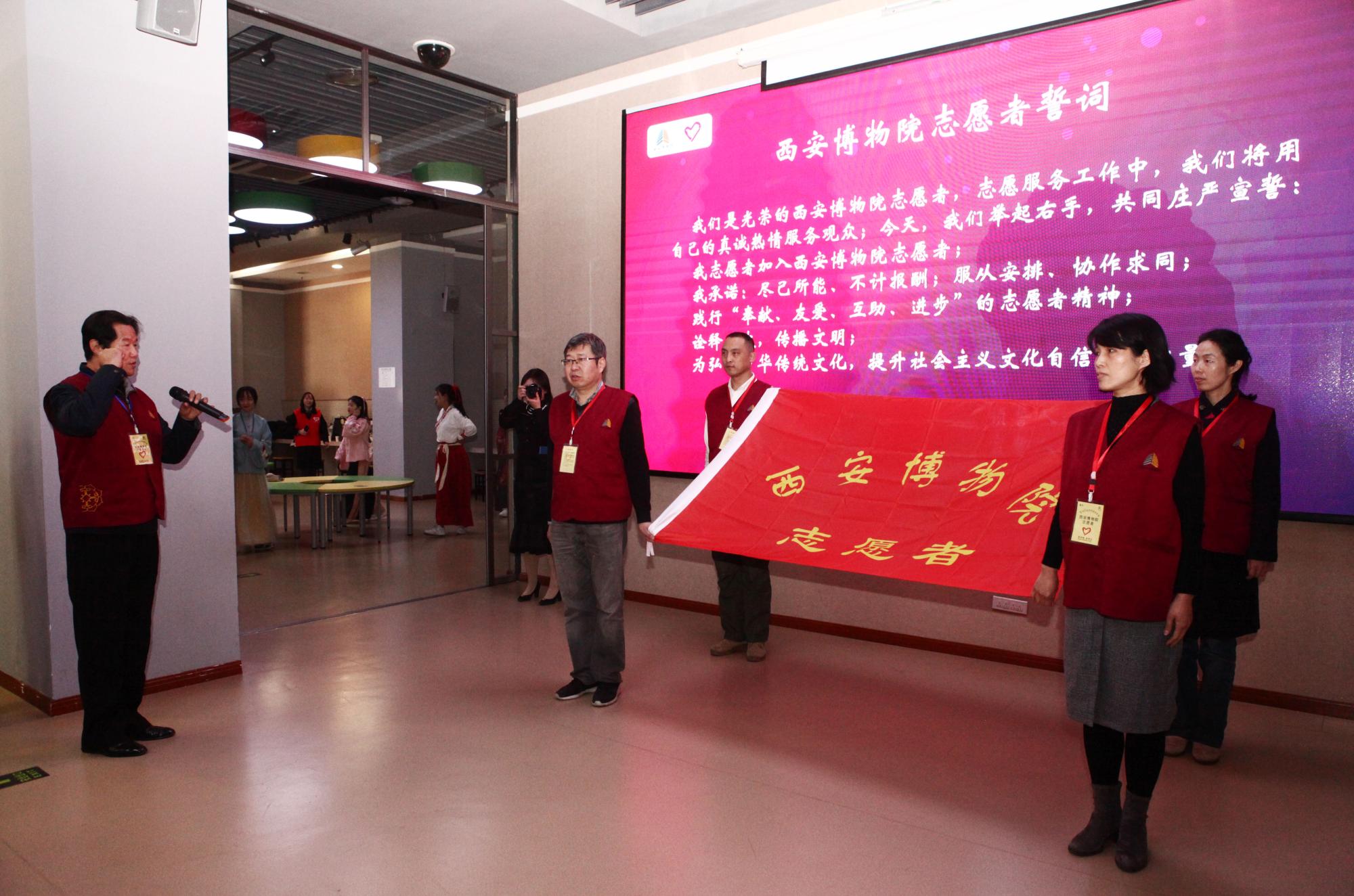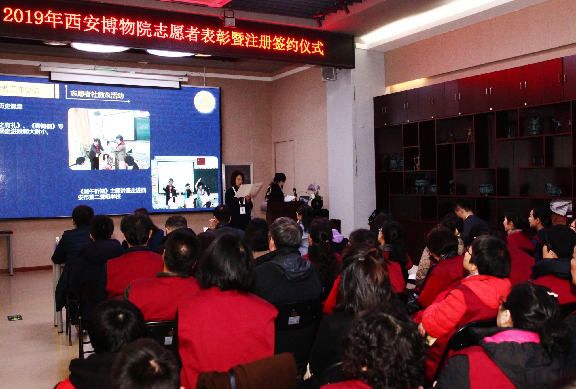 活动伊始,西安博物院教育推广部负责同志向大家汇报了本年度西安博物院志愿者工作的开展情况,对本年度辛勤付出的志愿者们表示感谢并期许明年将继续完善志愿工作管理,提升服务效果。博物院各部门负责同志为本年度优秀志愿者团队、优秀个人颁发奖牌和荣誉证书,大学生志愿者团队代表、社招志愿者代表分别进行了发言,分享了他们在西安博物院参加志愿服务工作的经历与收获。随后,院长余红健致辞,他代表西安博物院对志愿者的无私奉献表示感谢,诚挚欢迎全国各大高校在西安博物院建立教育基地,鼓励同学们积极参加社会实践活动并希望更多的青年同志加入到志愿服务工作中来。