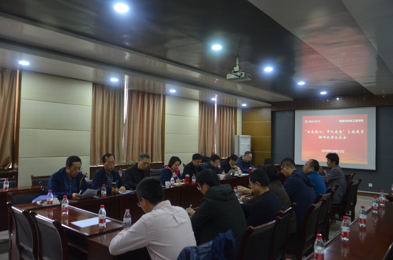 根据物理与光电工程学院开展“不忘初心、牢记使命”主题教育的总体安排,学院于10月22日下午,在西大楼412会议室召开主题教育调研成果交流会,学院领导班子成员分别结合各自调研题目就调研收获及思考进行了汇报交流。学院两委委员、组织员、系所负责人、教工党支部书记等参加了会议,学校主题教育指导组成员宁静到会指导。会议由党委书记独国社主持。