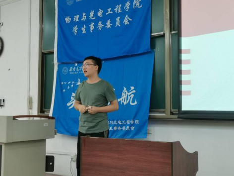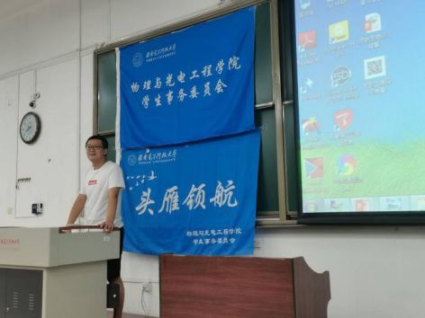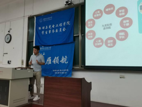 随后,2020级新生辅导员王纲老师结合2018、2019级书院建设,向领航员们介绍了这级新生所处大类招生背景下新书院建设的不同,对大类分流、转专业等相关问题进行了详细阐述。他说到,书院制是高校基于学生社区建设个性发展的一种新型教育管理制度,是顺应信息时代人才培养、高等教育改革的新要求。关于大类招生专业分流他太补充介绍了电子信息类的专业方向和发展前景,展示了我校电子信息大类下培养出的优秀校友。