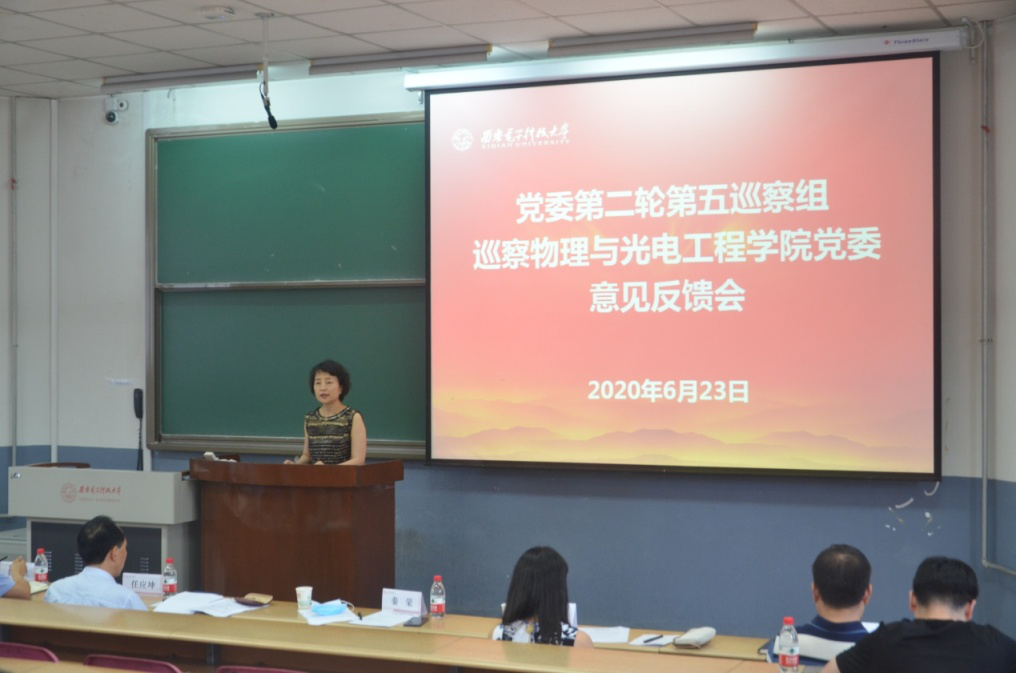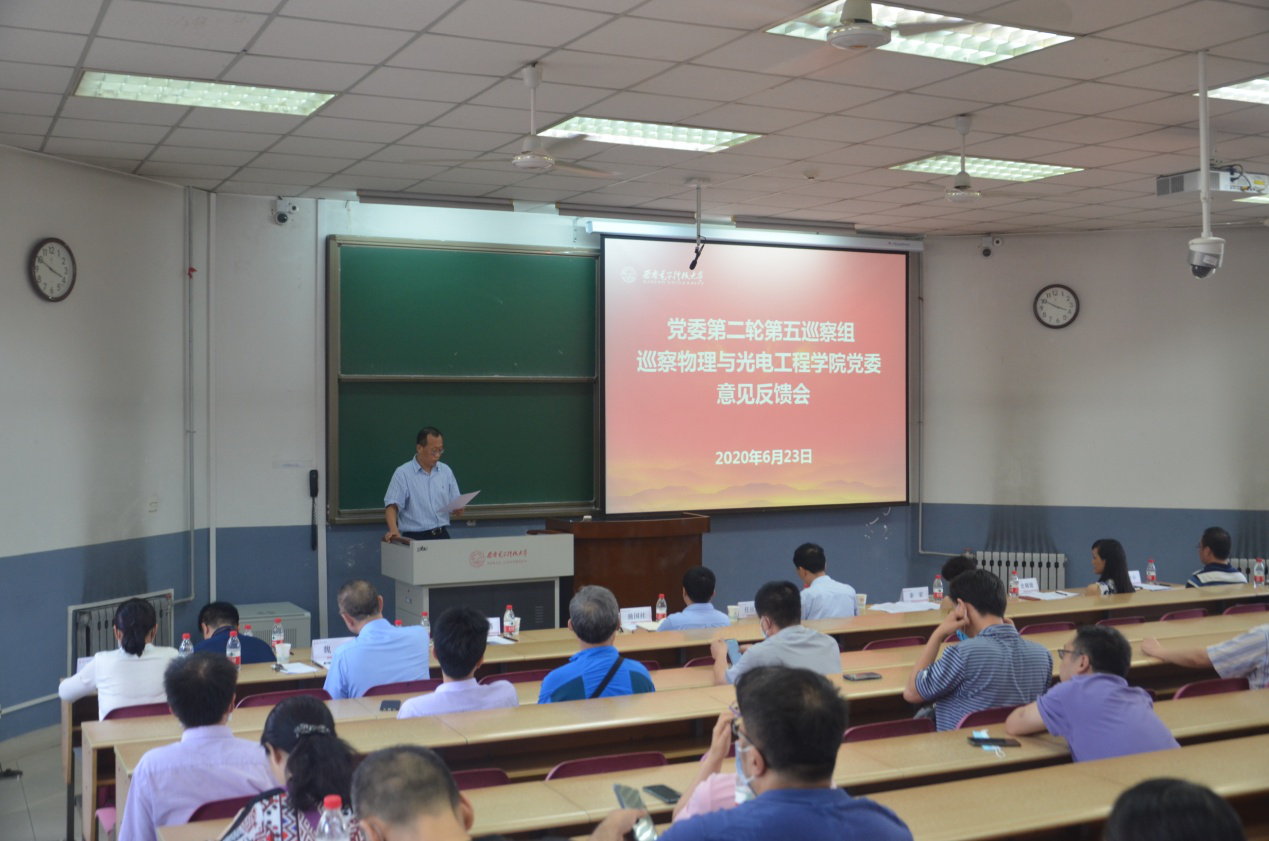 根据学校巡察工作领导小组统一部署,6月23日下午,校党委第二轮第五巡察组巡察物理与光电工程学院党委意见反馈会在北校区阶梯教学楼3-01室召开。校党委副书记、纪委书记、巡察办主任任应坤,第五巡察组组长秦荣、副组长史耀媛出席会议,会议由学院执行院长邵晓鹏主持。