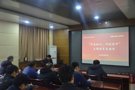 1月10日上午9:00点,物理与光电工程学院在北校区西大楼412会议室召开“不忘初心、牢记使命”主题教育总结会。学院领导班子成员、两委委员、组织员、教师党支部书记和师生代表20余人参加会议。会议由学院党委副书记林波主持。