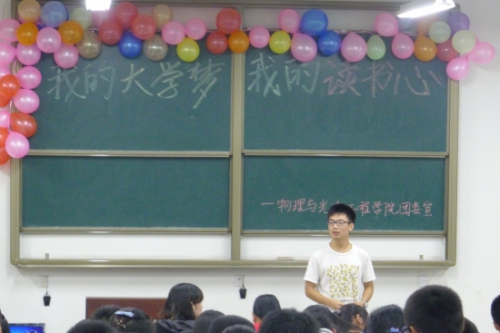 (通讯员 银凤)9月27号晚,以“我的大学梦,我的读书心”为主题的读书交流主题团日活动在A楼314教室举行,此次活动由物理与光电工程学院团委读书社主办,物理与光电工程学院团委各部部长与2012、2013级各班同学参加了此次活动。