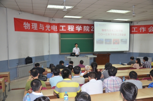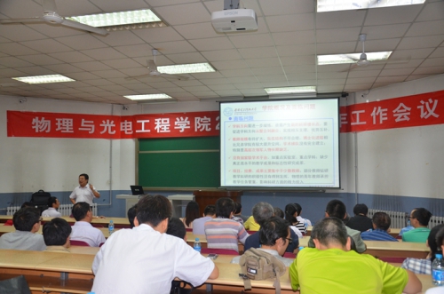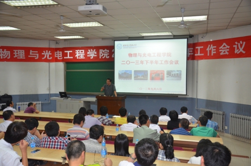 9月6日晚八点,物理与光电工程学院在北校区阶教101召开2013年下半年学院工作会议,传达学校2013年下半年工作会议精神,安排部署学院下半年具体工作。学院百余名教师参加了此次会议,副校长陈勇出席会议并讲话。会议由杨光暐主持。