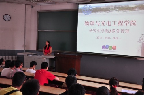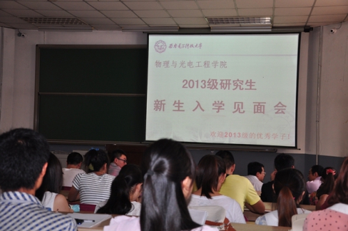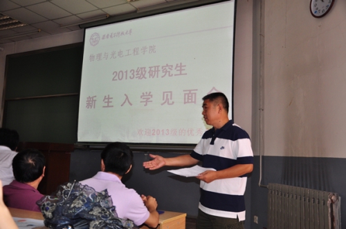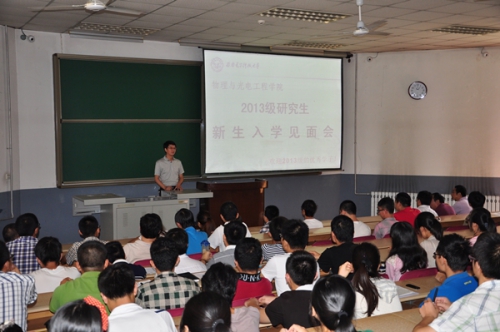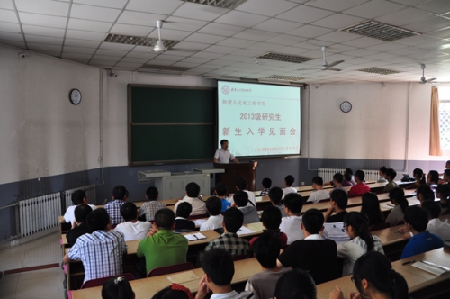 8月29日上午11点整,物理与光电工程学院在北校区教学楼101教室召开2013级研究生新生入学见面会,学院筹备领导小组组长郭立新,以及筹备领导小组成员杨光暐、李平舟、周慧鑫到场与2013级研究生新生见面,并对大家来PA捕鱼继续深造学习表示热烈的欢迎。