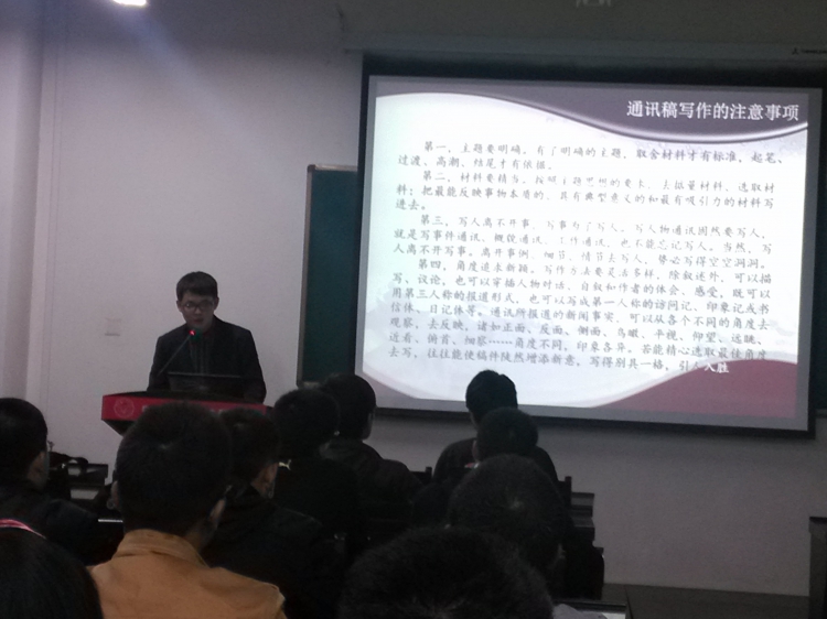 (通讯员 贾丹阳,洪邑晖)11月7日晚7点,物理与光电工程学院学生事务委员会在E楼III区315学术报告厅举行了学生干部通讯稿写作培训,由院学生事务委员会洪邑晖学长主讲,到场的有学院各组织秘书处成员和2013级各班通讯员。