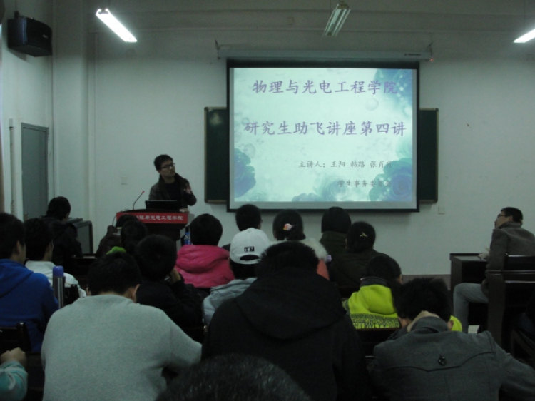 (通讯员:武彩玲 郭晋全)11月30日下午14:00,物理与光电工程学院研究生助飞系列讲座第四讲在E楼III区315报告厅举行。第四讲特别邀请韩路、张肖肖、王阳三位研究生主讲,本科2013级近200名同学参加了此次讲座。