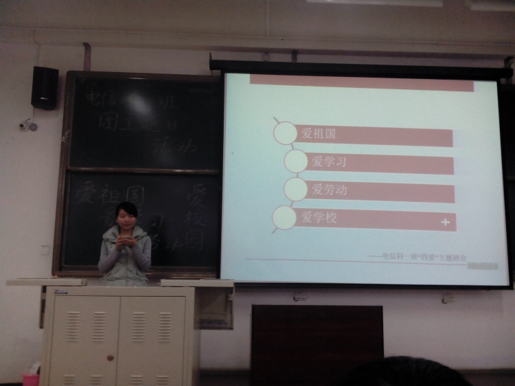 首先,团支书以最近的新闻事件切入,组织展开讨论,部分同学还对马航失联事件作了简要评论,讲话中渗透出了新时代大学生的爱国主义思想。随后进入本次活动的第一个环节,班长对上学期整体的各科期末成绩、内务检查得分、活动参与等情况作了通报,鼓舞同学们要培养乐观积极的生活态度,树立信心,力争上游,同时还邀请几位成绩比较好的同学上台分享自己的学习方法与心得。生活方面,团支书对优秀男女生宿舍进行了表彰和鼓励。此时进入第二个环节,学习委员为大家播放了一段关于我校历史的宣传视频,并结合所查资料做了细心讲解,描述了老一辈西电人的辛勤劳动及西电精神与现代发展密不可分的联系。活动在同学们的掌声中圆满结束。