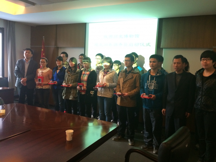 早晨8点半会议准时开始。会议第一项由陕西历史博物馆创优办主任赵慧回顾2013年的主要活动,纪检书记田景超致辞。会议第二项由田书记为2013年优秀调查员颁发证书,共有十六位同学获得了优秀表彰。会议第三项陕西历史博物馆与物理与光电工程学院团委正式签订2014年工作协议,志愿者们在仔细阅读了协议之后,签下了郑重的一笔。宣誓的右手举起、落下,志愿者庄严地完成了签约仪式。之后由调研组李博雅老师为2014年新一届调查员做培训,李老师为调查员们详细介绍了调查意义及调查方式,并对新一届的志愿者调查员寄予厚望,希望他们可以成长得更加优秀,帮助工作人员完成各项社会调查任务。培训结束后陕西历史博物馆到会领导与新一届的调查员一起合影留念。最后由工作人员带领新进调查员参观展厅。