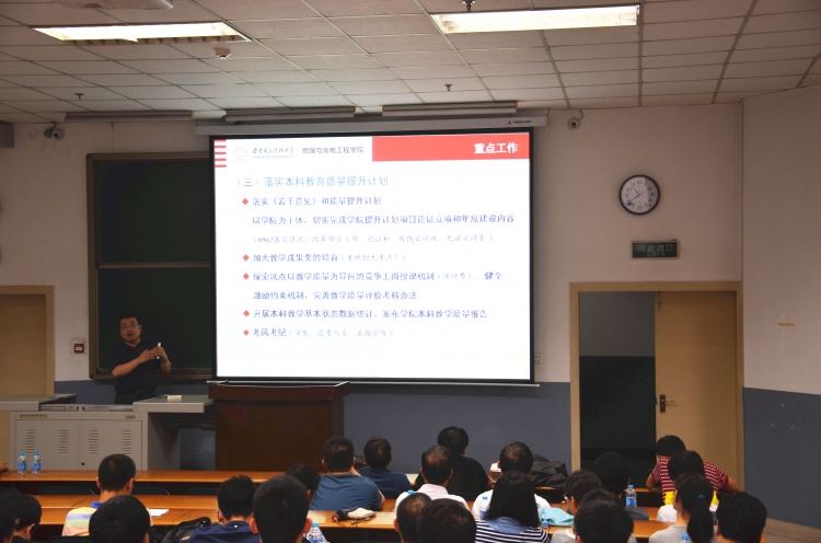 会上,学院执行院长郭立新全面传达了学校工作会议的主要内容,并在简要总结学院上半年工作的基础上,通报了学院下半年重点工作。针对学院发展过程中面临的困难和形势,郭立新结合各项指标完成情况,就本科教学、教师队伍、学科建设、科研平台建设、办公用房调整等方面的工作进行了全面深刻的分析,引起了全体与会教师的共鸣。同时,他还鲜明地提出学院2014年下半年的重点工作思路:一是全面贯彻落实学校五届一次教代会和本科教育质量提升工作会议精神,坚持群众路线,完善治理体系,促进学院融合;二是结合“十三五”规划的启动,谋划好学院学科发展和科研平台建设规划;结合“2011协同中心”,进一步凝练专业方向;三是强化特色立院,全面推行“桃李行动计划”,切实促进教育质量提升;四是积极推进人才工程,切实加大教师(和团队)引进力度;五是推进和中电22所、27所、53所及中航618所等单位的实验室共建工作,积极申报“激光雷达成像”国防重点学科实验室;结合办公用房调整,积极筹建学院“光电探测与成像”实验中心;六是坚持立德树人,推进“大学生基础道德塑造计划”,做好头雁领航、课程地图、学院大讲堂等品牌活动,提高人才培养质量。