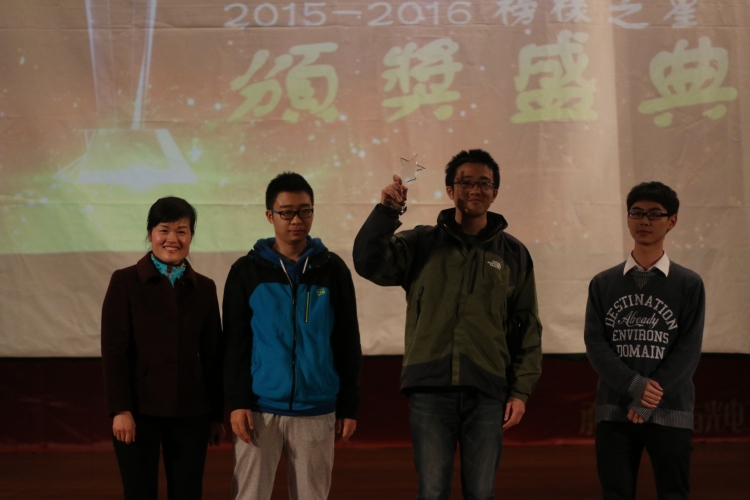 继院长讲话后,晚会进入第一个环节“榜样之星”颁奖典礼。荣膺“榜样之星”的有F420实验室、神锋拔河队、优秀领航员、优秀教师鲁振中。阵阵音乐伴随着短片,F420康佳实验室全体成员对科技求真探索精神感染了在座的每一个人;而物光神锋拔河队全体成员在比赛中的奋勇拼搏展现了物光好男儿团结一致的英雄风采。 “头雁领航”计划的全体领航员,对新生爱心引导,耐心援助,被称赞为物光青年的榜样;鲁振中老师生动的课堂使无数的同学得到启迪,备受同学们的赞赏,荣膺最受欢迎老师的称号。