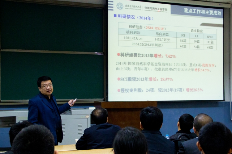4月2日晚,物理与光电工程学院2015年工作会议暨领导班子述职及民主测评会议在北校区阶梯教学楼208报告厅召开,副校长陈勇出席了本次会议。会议由学院党委副书记林波主持,全院教职工参加了本次会议。