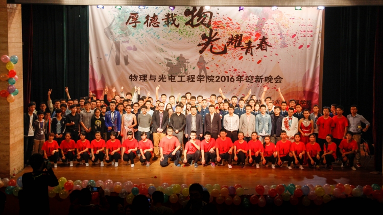 (通讯员:黄须村 赵梦媛 张倩 丁俊发 谢晶晶 矫殿成)2016年10月20日,“厚德载物,光耀青春”物理与光电工程学院2016级迎新晚会在大学生活动中心小剧场举行。学院执行院长郭立新,党委书记杨光暐,副院长李平舟,党委副书记林波莅临现场,学院教师代表、研究生代表、大一全体新生观看了晚会。