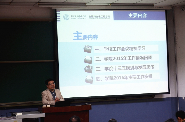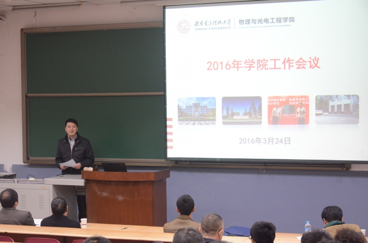 3月24日晚,物理与光电工程学院于北校区阶梯教学楼110召开2016年工作会议暨领导班子成员民主测评会。副校长陈勇出席会议并讲话,学院全体教职工参加会议。大会由学院党委书记杨光暐主持。