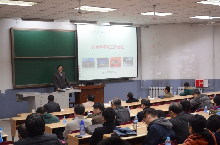 会上,执行院长郭立新做了学院工作报告。向全院教职工传达了学校2016年工作会议的主要精神,并在全面回顾学院2015年工作情况的基础上,分析阐述了学院“十三五”规划的总体思路,并围绕师资队伍、人才培养、学科科研、国际合作等方面提出了明确的发展方向,并对核心指标进行了量化。他鼓励大家要举全院之力,把学院建设成特色鲜明、国内一流、国际先进的研究型学院。结合2016年学院具体工作安排,他谈到要求全院上下要坚持问题导向,勇于承担责任,破解发展难题。