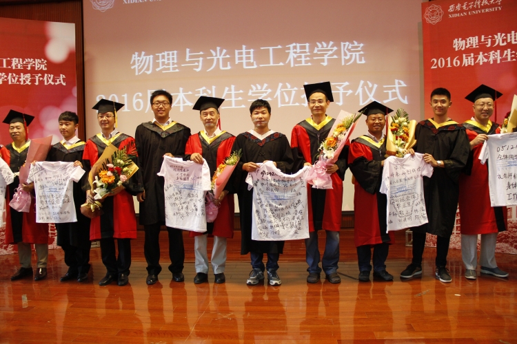 授位仪式后,2016届毕业生代表向出席仪式的各位老师献花,并送上带有全体毕业生签名的T恤,以感谢学校和学院的辛勤培育。几位老师也向毕业生赠予了带有“物理与光电工程学院”标志的笔记本,祝愿他们前程似锦,大有作为。
