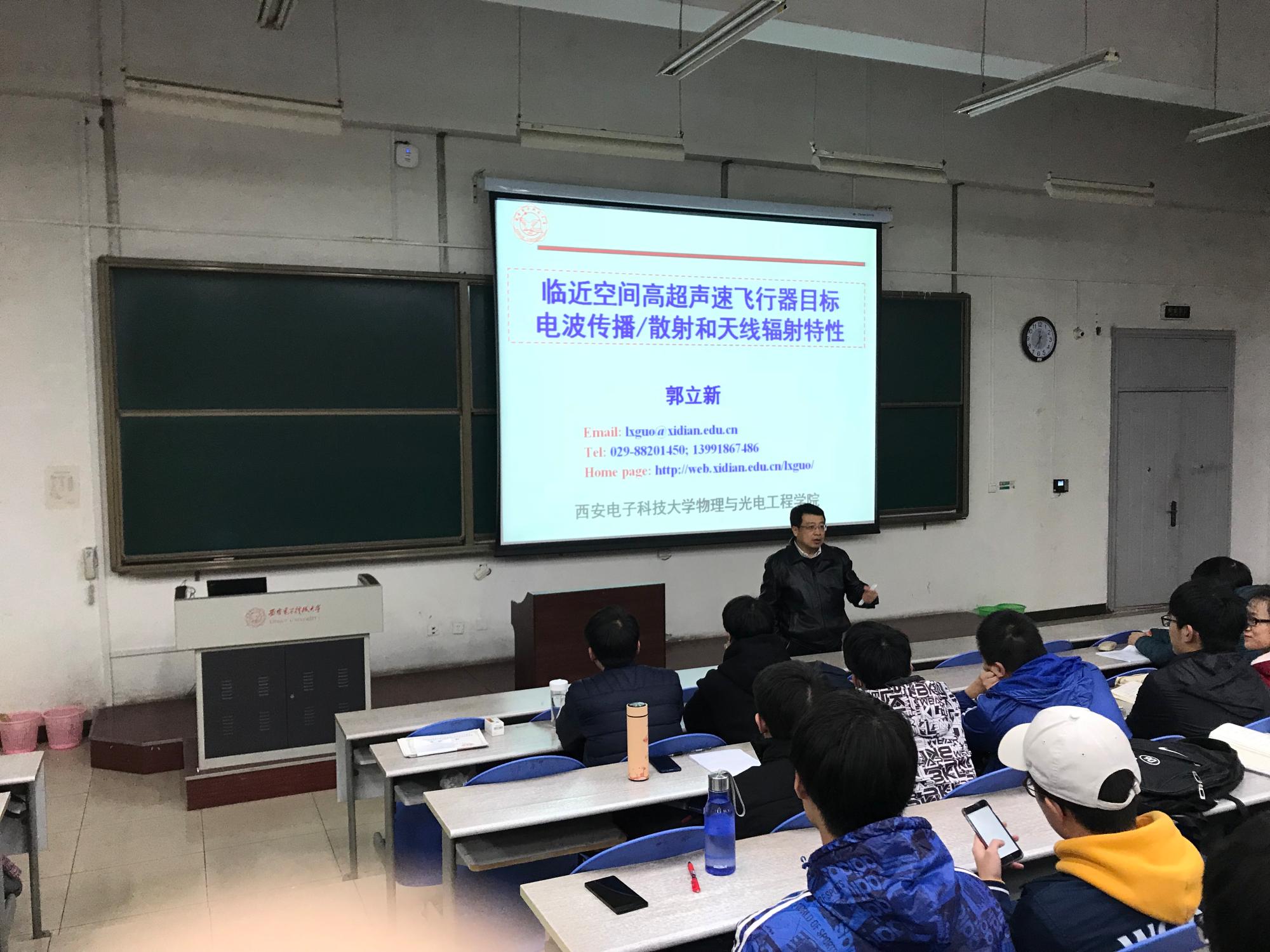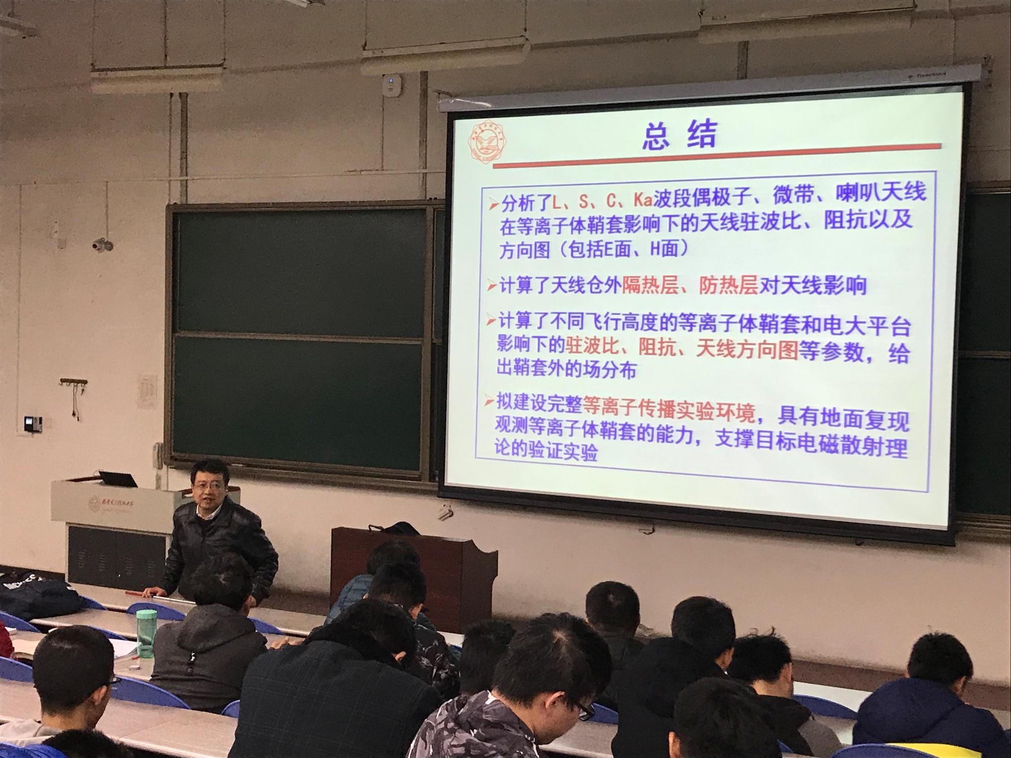 (通讯员:宫超越)2017年11月30日晚七点,物理与光电工程学院于B433教室开展了题为“临近空间高超声速飞行器目标电波传播/散射和天线原理辐射特性”的学院大讲堂活动,由物理与光电工程学院院长郭立新主讲。郭院长从该项目的重要内容“等离子体鞘套”入手,结合研究进展,为大家生动地展示了其重要意义,让同学们感受到了所学专业对国防事业的重要贡献。