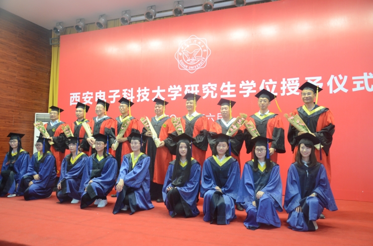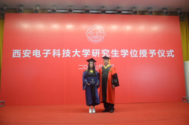 最后,副校长杨银堂上台,为每一位毕业生颁发学位证书,执拨穗礼。毕业生手持学位证书,与杨银堂教授合影留念,为自己的硕士研究生生涯画上了圆满的句号。