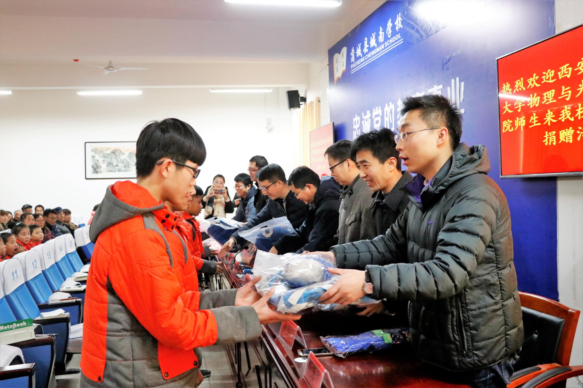 在捐赠仪式上,学院向蒲城县城南学校建档立卡的家庭经济困难学生赠送了书包、帽子、手套等学习用品和生活用品,并向城南学校赠送了各类体育器材。