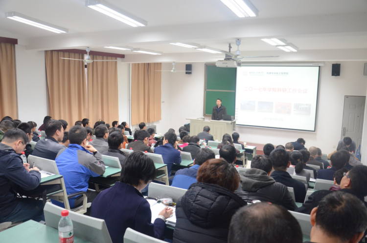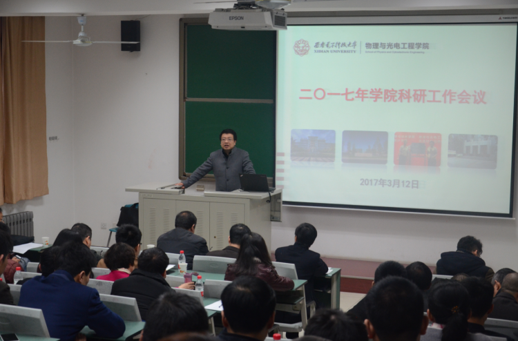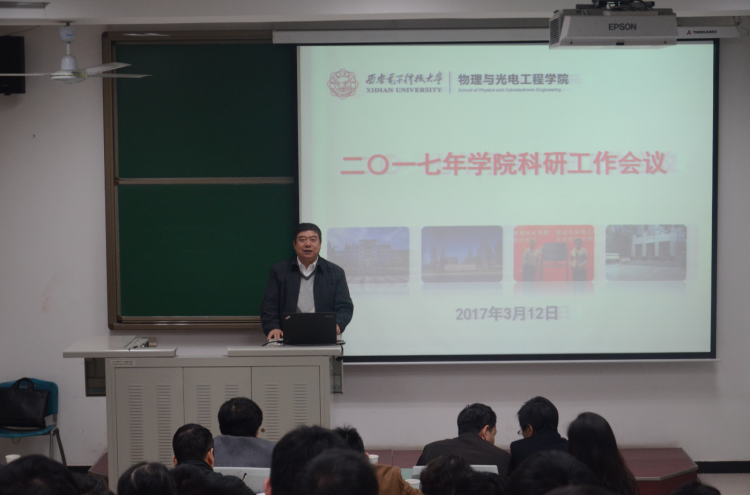 (通讯员:李维嘉)3月12日上午,物理与光电工程学院于北校区西大楼219教室召开2017年学院科研工作会议,旨在总结年度工作,凝练发展方向,交流心得体会,共同谋划学院科研工作的发展大局。副校长杨银堂、科研院常务副院长石光明、副院长蔡固顺、院长助理刘珠梅等领导干部,物光院领导班子及全体教师参加了此次会议。会议由学院副院长邵晓鹏主持。