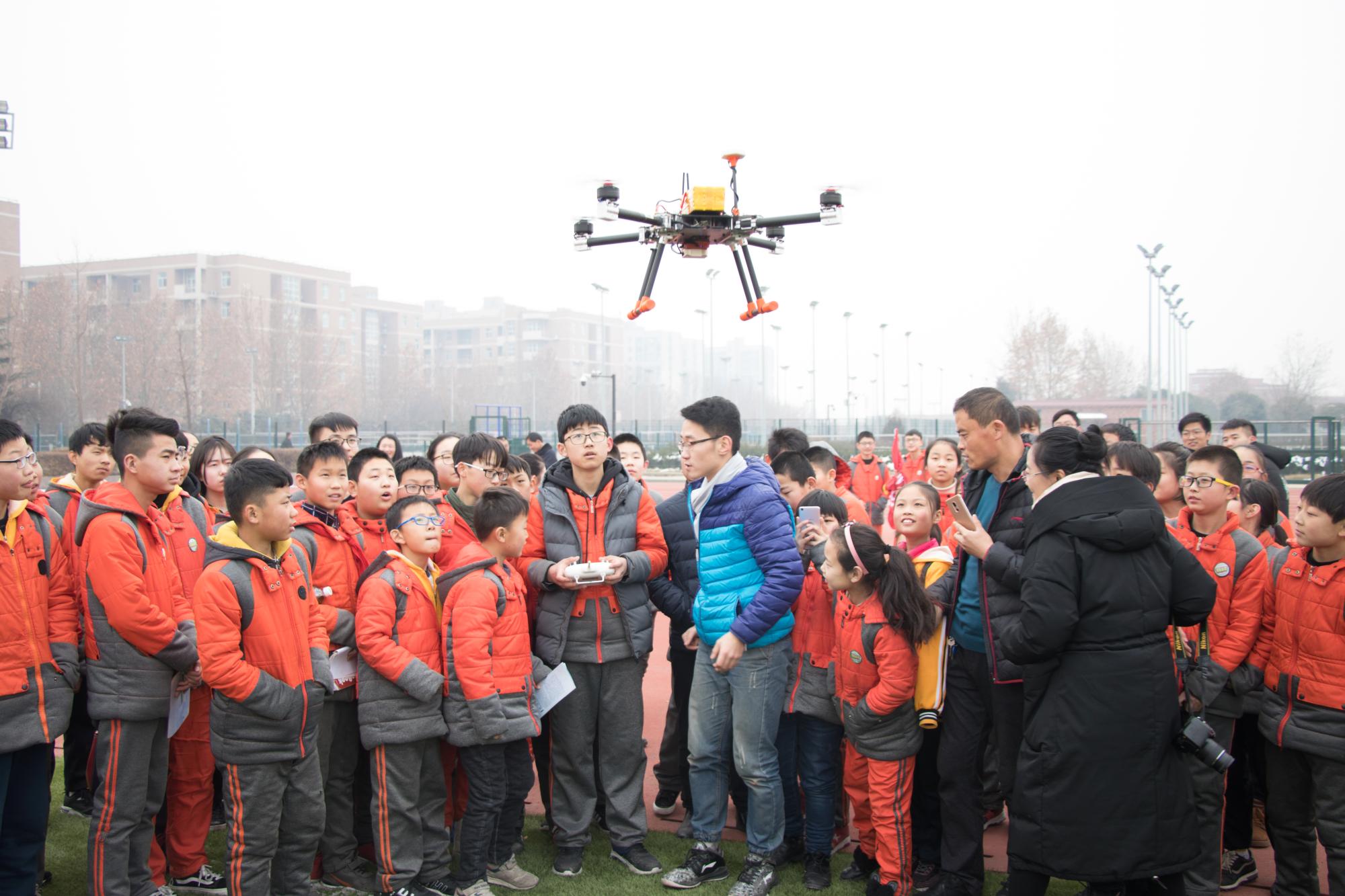 午餐过后,同学们来到南操场,观看学院大学生课外科技作品“鲲鹏无人机”的演示。这个作品刚刚获得第三届“互联网+”大赛的金奖,电子科学与技术专业的大三学生,这个作品的主要参与者方镇向同学们讲解了无人机的飞行原理和主要功能,并现场展示了无人机的操作,他还鼓励同学们好好学习,在以后的大学生活中也多多参加科技制作。