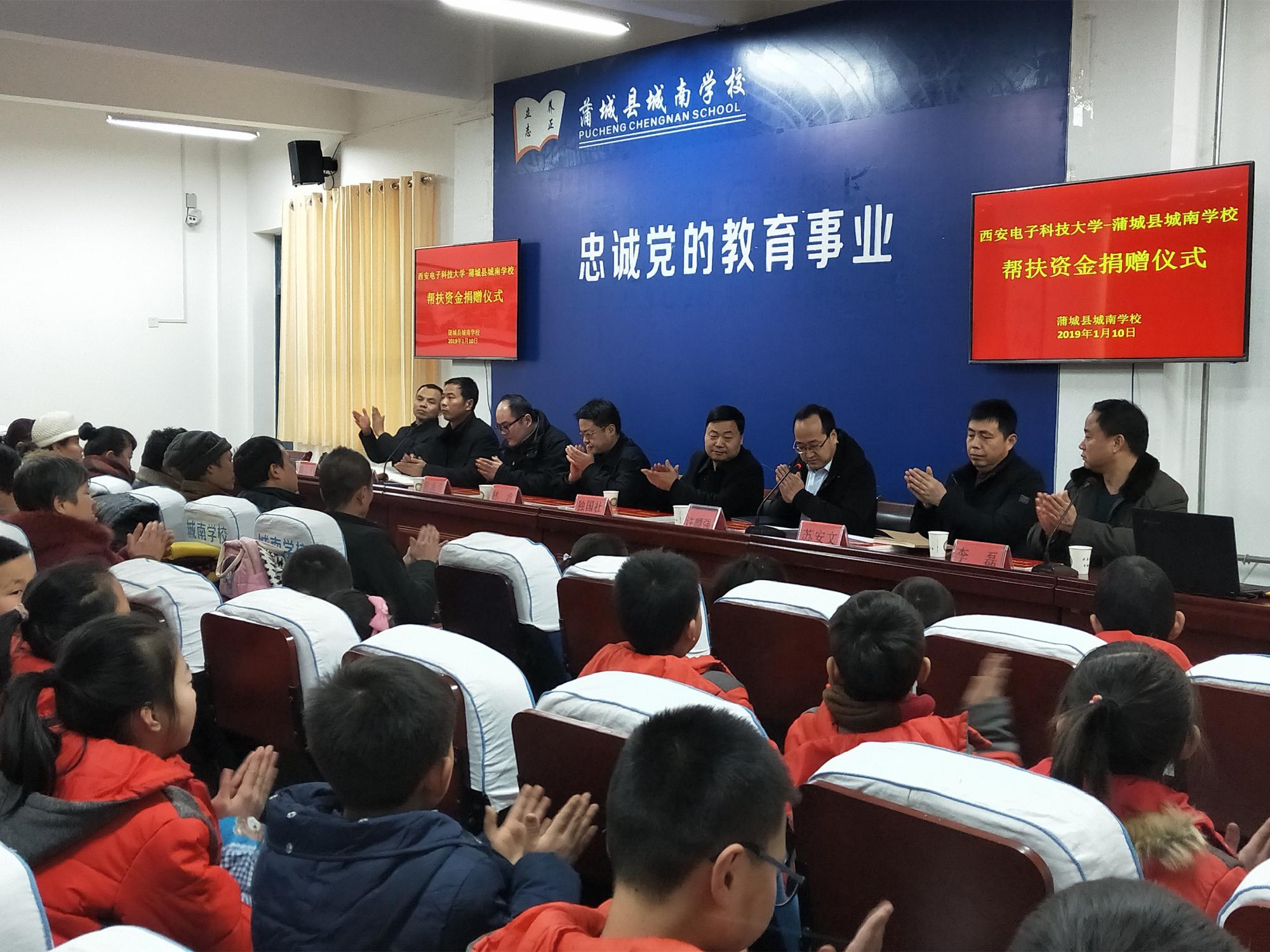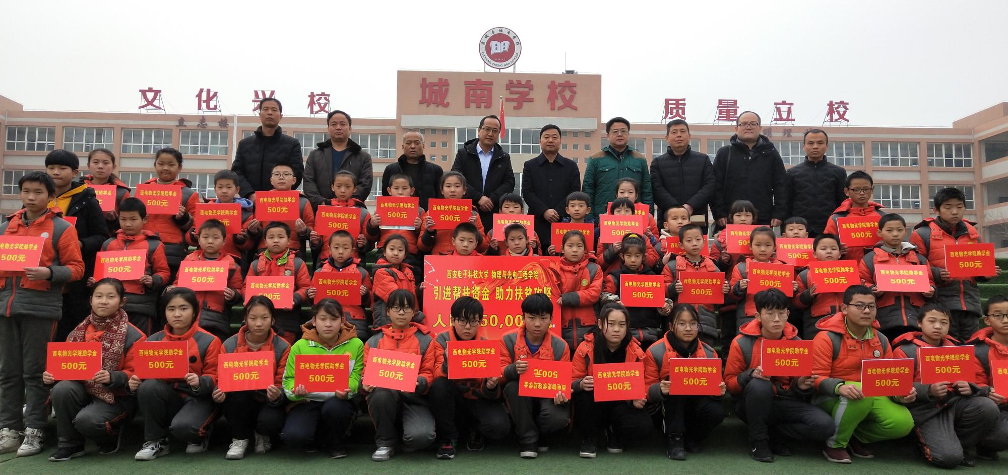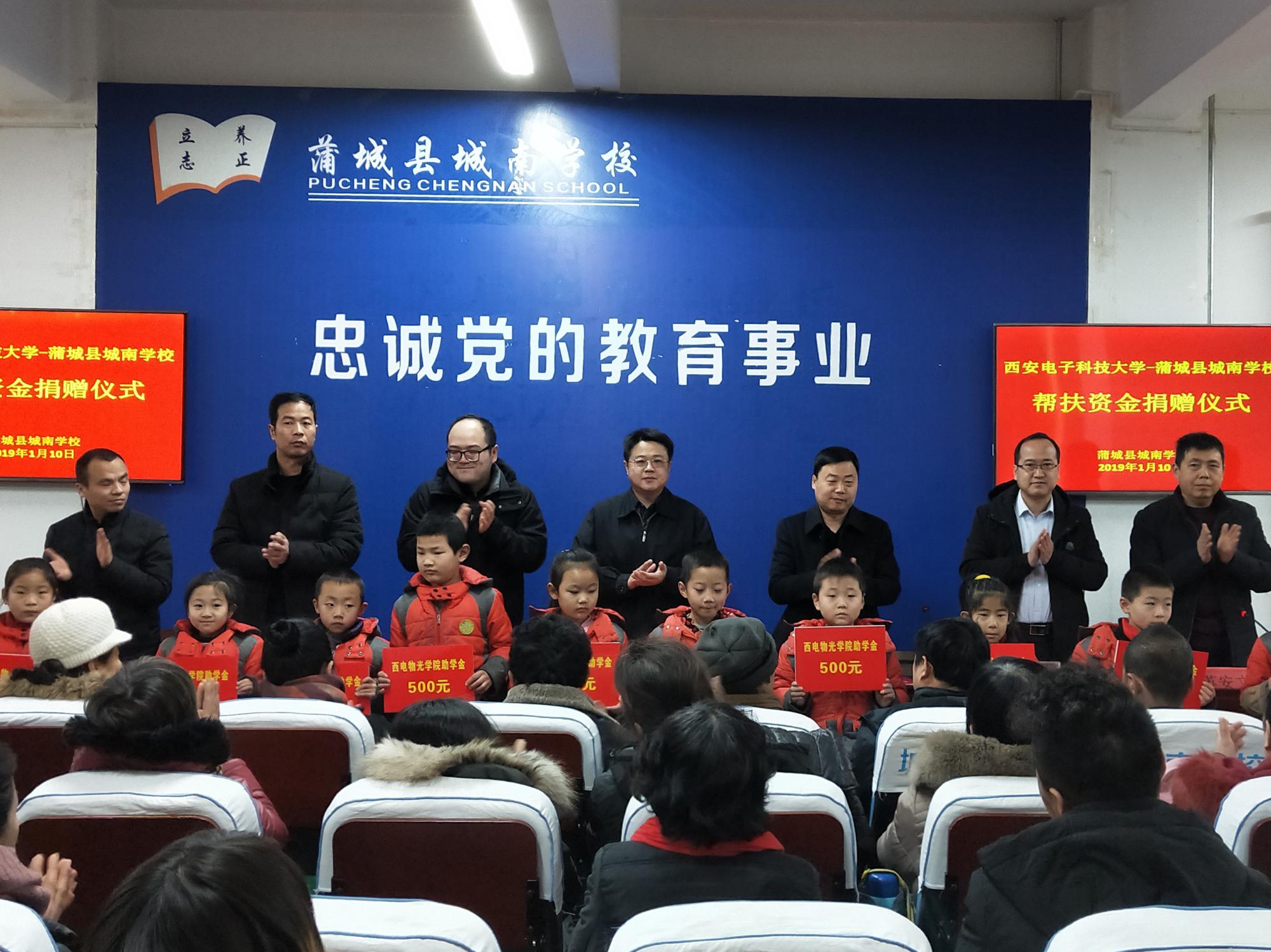捐赠仪式上,独国社在讲话中谈到,学院充分发挥高校在国家脱贫攻坚工作中的特殊优势作用,将“扶贫”与“扶智”、“扶志”相结合,多次向蒲城县城南学校捐赠课外书籍、文体用具、科创工具,开展对接洽谈、志愿授课、科技讲堂等各类扶贫对接活动多次,建立了蒲城县城南学校“PA捕鱼官方网站大学生志愿服务基地”、“PA捕鱼官方网站物理与光电工程学院大学生实践基地”,援建“西电物光院-蒲城城南学校学生科技活动室”,并邀请城南学校师生来我校参观交流。本次学院发挥校友企业与合作单位资源优势,与西安中科洺光测控技术有限公司、洛阳长峰电子科技有限公司签署协议,引进5万元帮扶资金,用于设立“2018年PA捕鱼官方网站—蒲城县城南学校贫困生‘物光助学金’”和帮助改善城南学校基础教育设施。城南学校要用好帮扶资金,为学生提供更加优质的教育服务,使受助学生能够不受经济困难束缚,早日成长为祖国的栋梁之才。希望同学们铭记社会各界的深情关爱,正视并战胜困难,不负家庭和社会的厚望,把关爱化为奋发学习的动力,坚定信心,自强不息,刻苦学习,提高素质,练好本领,努力成为对国家、对社会有所作为、有所贡献的人才,以优异的成绩和将来的出色表现,报效祖国,回报社会。