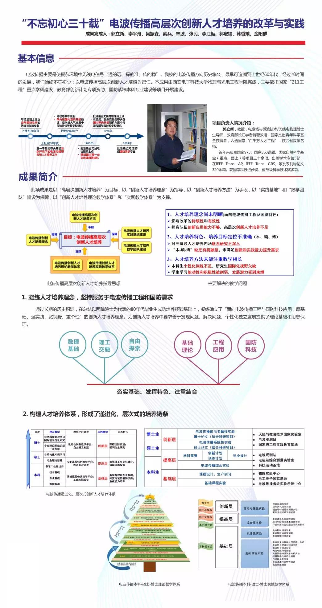 近日,教育部公布了2018年国家级教学成果奖(每四年一届)的获奖项目名单。其中由PA捕鱼郭立新教授等人完成的《“不忘初心三十载”——电波传播高层次创新人才培养的改革与实践》成果荣获二等奖。国家级教学成果奖是由国务院所确定的国家级奖励,是与国家自然科学奖、国家技术发明奖、国家科技进步奖并列的国家级奖项,它代表着我国高等教育教学工作的最高水平。由我校(西电)作为第一完成单位推荐申报的5项成果全部获奖,包括一等奖1项、二等奖4项。