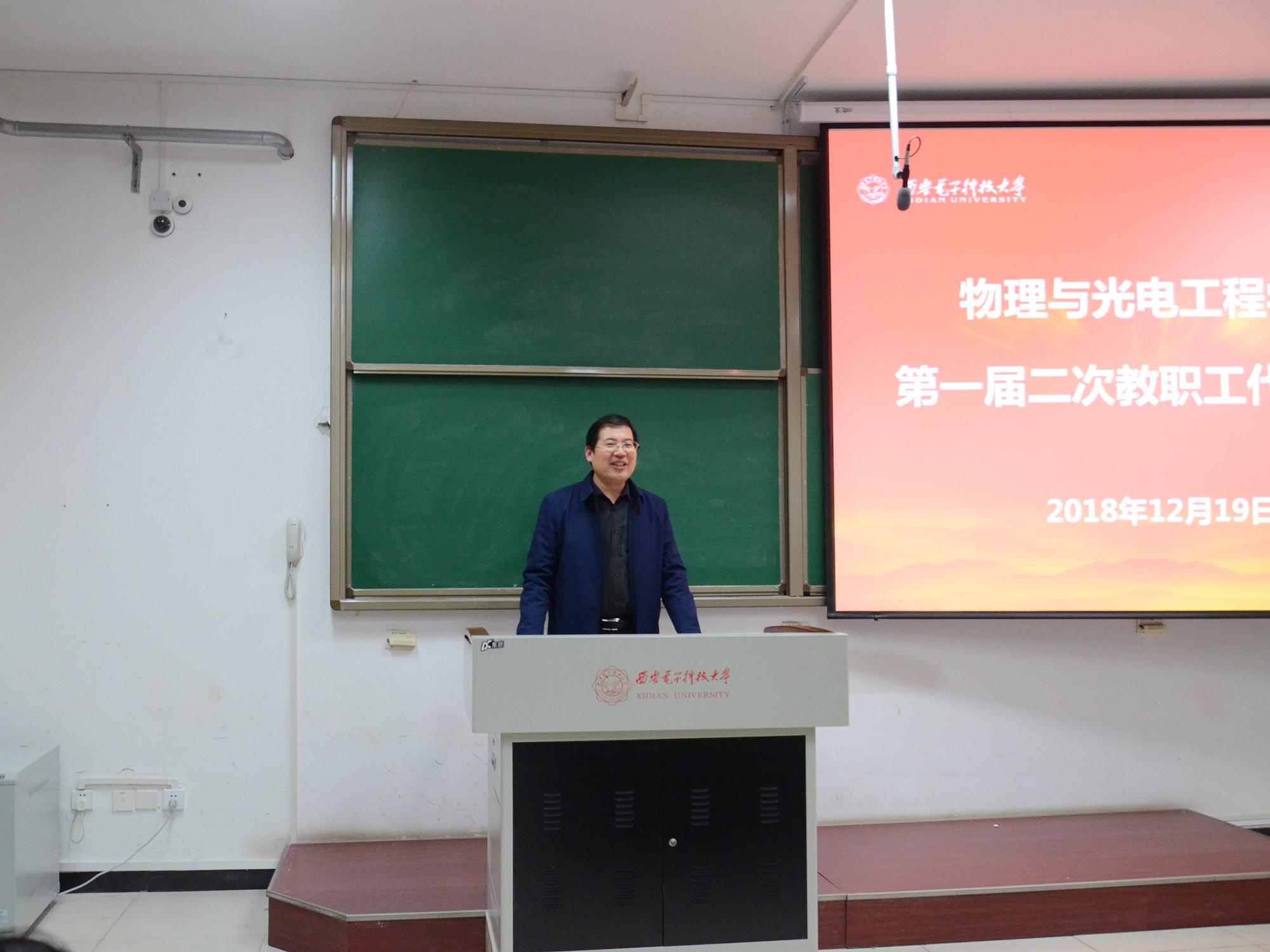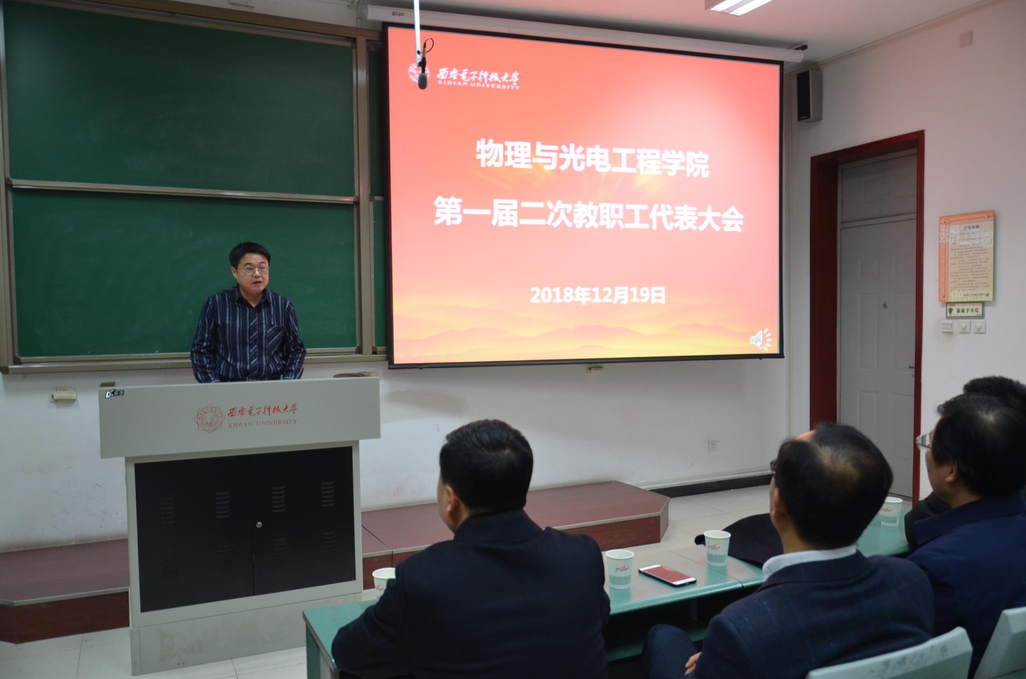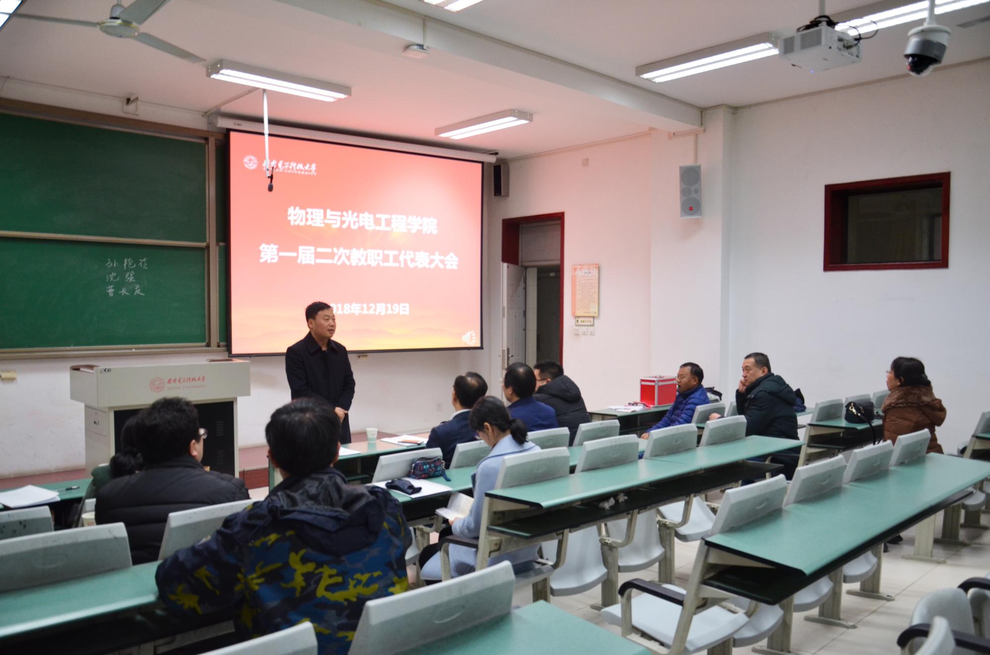(通讯员:姚娇)12月19日晚,物理与光电工程学院第一届第二次教职工代表大会暨工会会员代表大会在西大楼106教室隆重召开,会议选举产生了学院出席学校第六届教职工代表大会暨工会会员代表大会的代表。副校长高新波、校扶贫办主任沈强、学院领导班子等47位教代会代表参加了会议。大会由学院党委副书记林波主持。