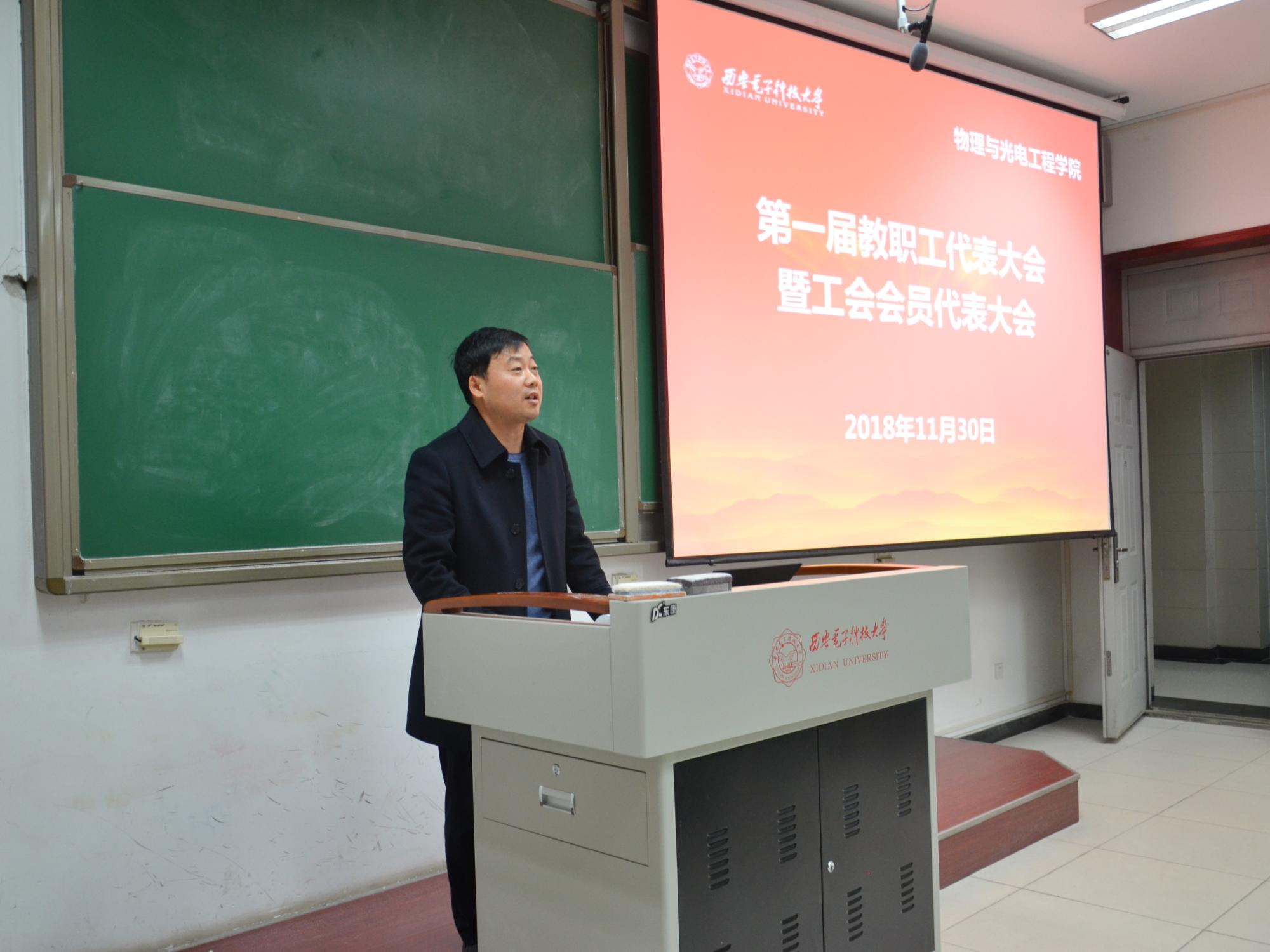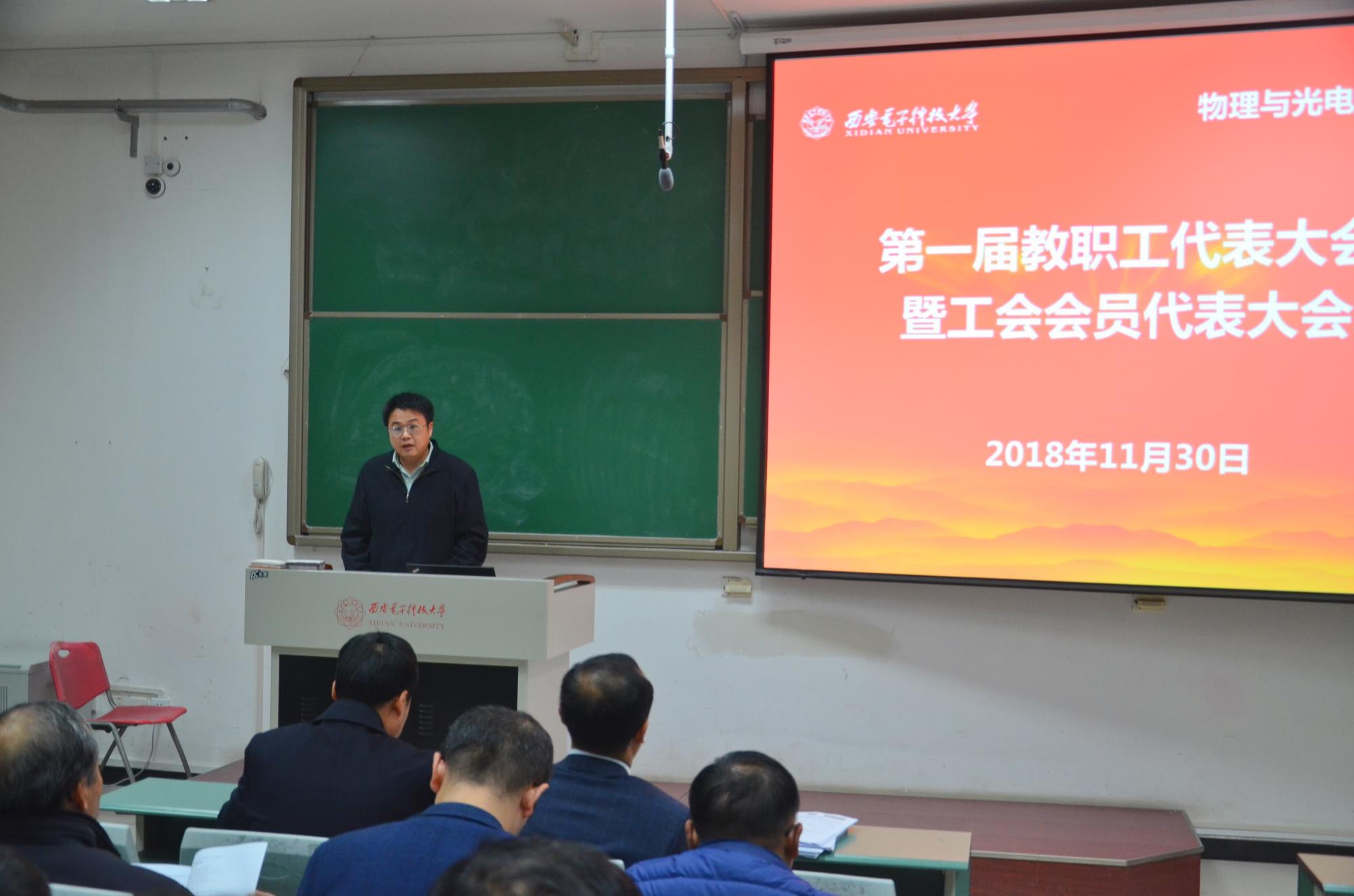 学院党委副书记、纪委书记林波主持召开物光院第一届工会会员代表大会。大会就前期推荐产生的11位工会委员候选人进行了差额选举,最终投票产生了9位学院新一届工会委员,并选举独国社为学院工会主席。