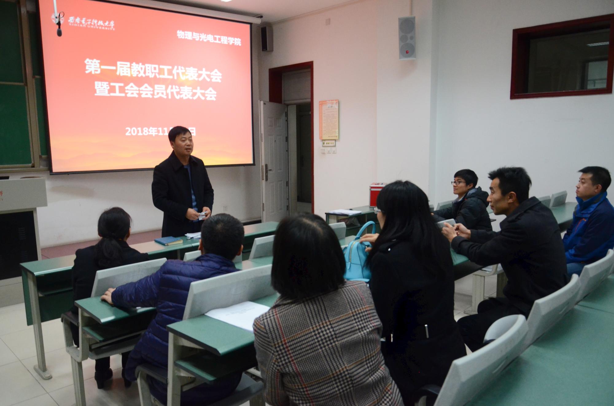 (通讯员:姚娇)11月30日晚,在雄壮嘹亮的国歌声中,物理与光电工程学院第一届教职工代表大会暨工会会员代表大会在西大楼106教室召开,会议表决通过了学院2018-2020年专业技术岗位聘任实施方案,投票选举产生了学院新一届工会委员。学院领导班子等53位教代会代表参加了会议。大会由学院党委书记独国社主持。