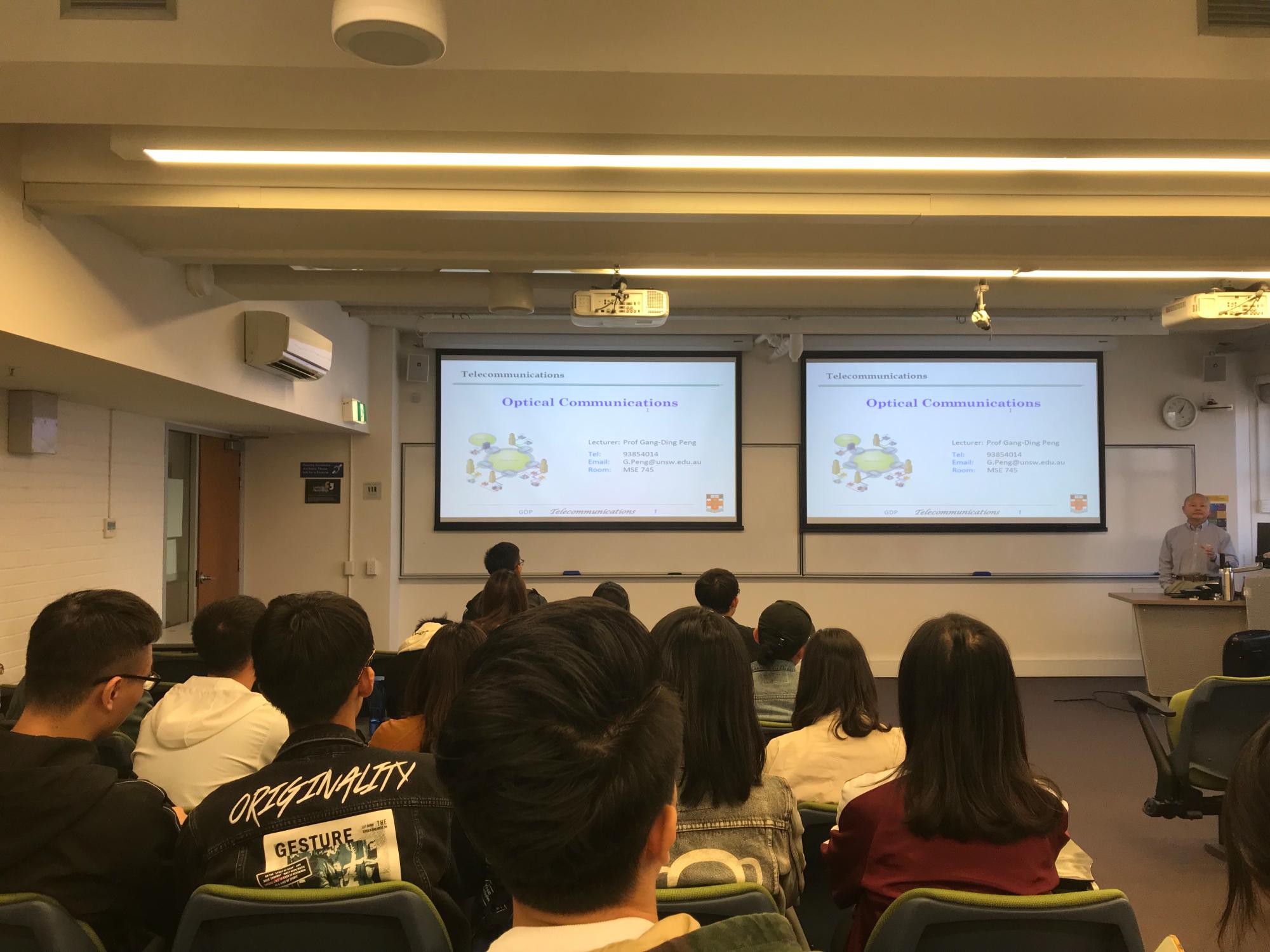 电子信息类专业课程由新南威尔士大学光电子研究中心主任,美国光学学会会士、国际光学工程学会会士的Gang-ding Peng教授主讲。Peng教授授课方式非常独特,讲授内容深入浅出,常常先抛出一个问题再逐步引导学生们去思考,在学生思考的同时会用简洁明了的陈述帮助学生加深理解。彭教授还邀请同学们参观了光电子研究中心的各类实验室,了解了新一代光纤的研发过程,引起了同学们极大的兴趣。