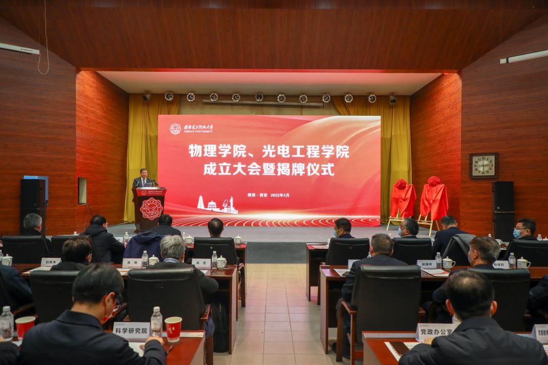西电新闻网讯(通讯员樊晓张乐平)3月1日下午,PA捕鱼官方网站、光电工程学院成立大会暨揭牌仪式在北校区科技楼报告厅举行。陕西省科学技术厅副厅长赵怀斌、陕西省人民政府学位委员会秘书长袁宁、中国科学院西安光学精密机械研究所所长马彩文等10余位嘉宾出席仪式。国家自然科学基金委员会副主任谢心澄、原中国科学院物理研究所所长王玉鹏等9位院士以及20余所兄弟高校和单位的领导专家以线上或线下的方式参加仪式。学校全体校领导、相关职能部门、学院负责人、相关一级学科及学科方向负责人、教师和学生代表共同参加了仪式。仪式由党委副书记杨银堂主持。