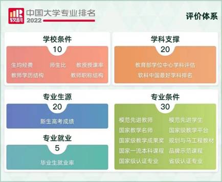 该评价体系通过学校-学科-专业三个层次评价给出每个专业的综合评级,由学校条件、学科支撑、专业生源、专业就业、专业条件五类指标组成,是迄今为止覆盖专业数量最多、参评专业规模最大的中国大学本科专业排名。