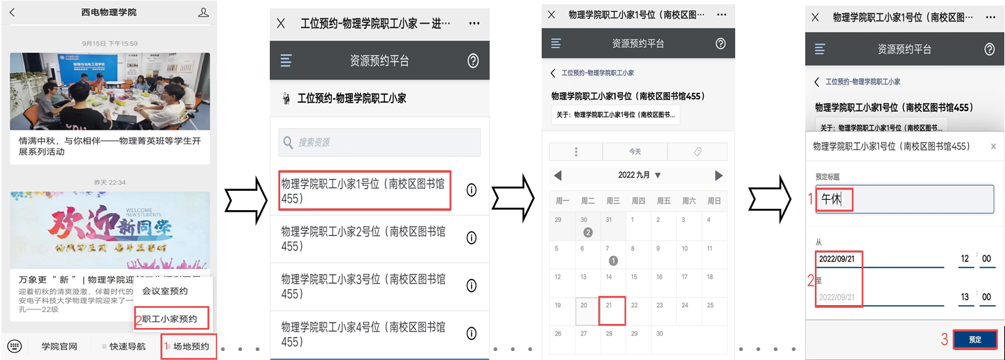 【预约方式】:微信公众号“西电PA捕鱼官方网站”-场地预约-职工小家预约-选择工位、日期-预约提交-预约成功(注:每人每天仅限预约1次工位)。