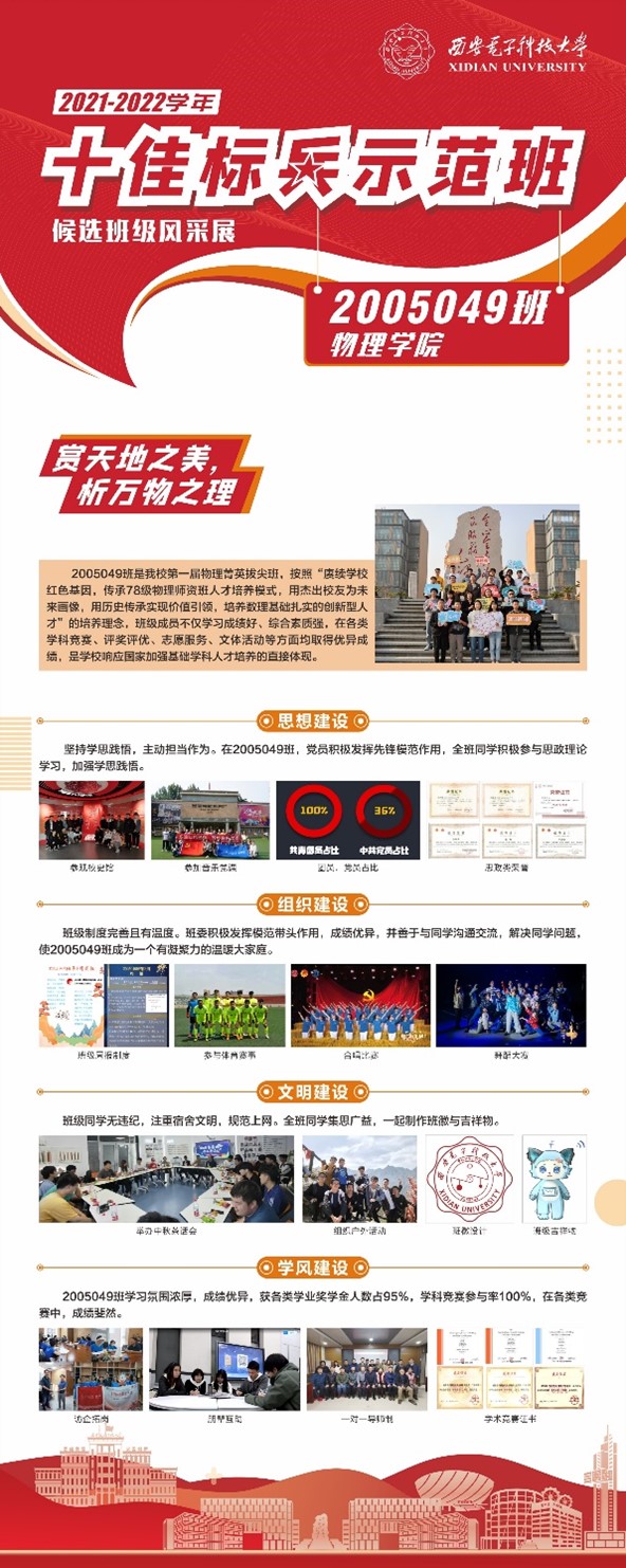 2005049班又名物理菁英拔尖班,是我校为服务国家重大战略需求,响应国家基础学科拔尖人才培养战略于2020年设立的拔尖班。作为首届物理菁英拔尖班,2005049班以赓续学校红色基因、传承创新精神和扎实数理基础为目标,班级成员立志成为德智体美劳全面发展的菁英人才。