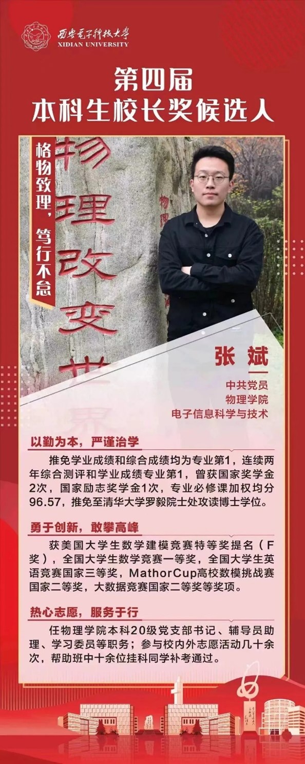“校长奖”是学校学生个人最高荣誉,为褒奖恪守西电校训,弘扬西电精神,综合素质全面,在学术研究、创新创业、社会公益、文体艺术等某方面事迹突出的学生先进个人。2019级本科生张斌在答辩环节展示了自己在大学从寻梦到追梦,最后圆梦的故事。从沧州市南皮县那一方小小的村庄来到西电,张斌在大一时期观看一次校长奖的答辩,台上自信从容的学长学姐给予了他榜样的力量,为他照亮了一个全新的世界,梦想从此落地生根,他暗暗下定决心,将来一定也要像优秀的学长学姐一样,在青春的赛道上不断跑出更好的成绩!如今,张斌以优异的成绩直博清华大学院士门下。他说,以梦想为圆心,奋斗为半径。心怀梦想,不停的走下去,终有一天会圆梦。努力越多,形成的圆也就越大。
