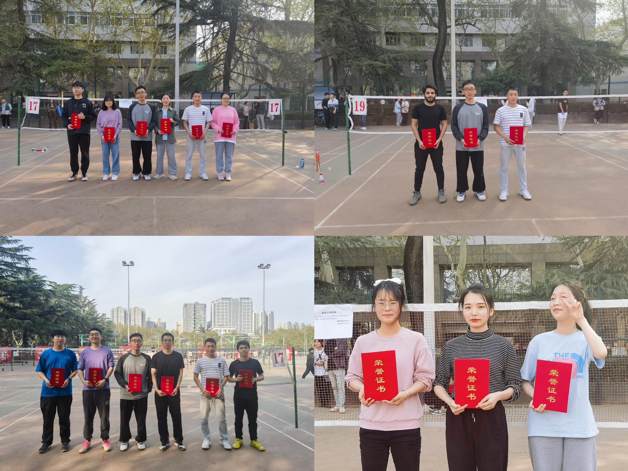 经过一天的激烈比赛,第一届“春风杯”研究生羽毛球赛落下帷幕,学院罗文博同学获得了男单冠军,吴霞同学获得了女单冠军,徐数平和罗文博组合获得了混双冠军,罗文博和梁帅组合获得了男双冠军,吴霞和赵佳欣组合获得了女双冠军。