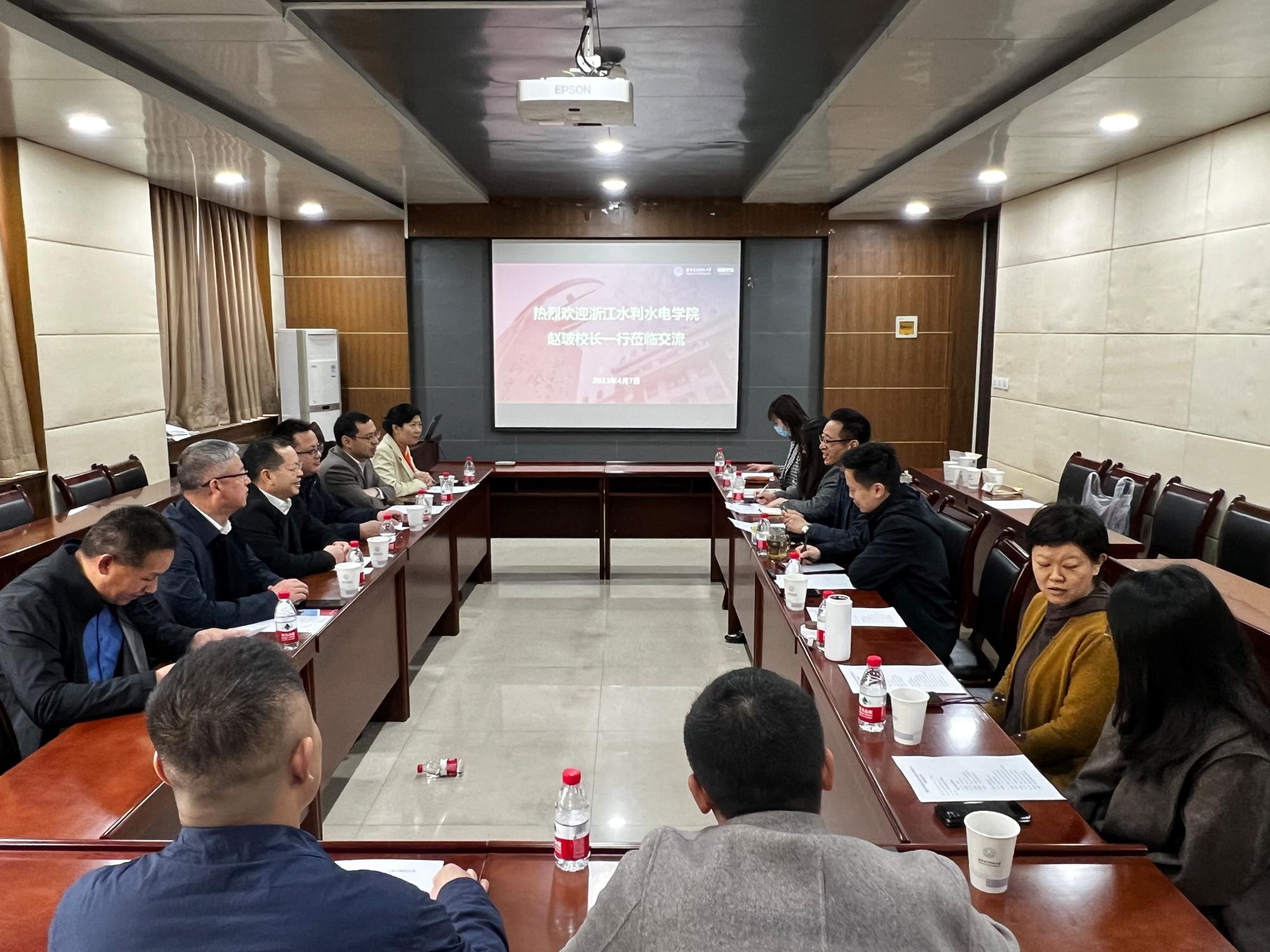 黄军荣向赵玻副校长一行到来表示欢迎。他简要介绍了西电半部电台起家、长征路上办学的辉煌校史以及学校目前的整体情况。赵玻介绍了浙江水利水电学院的历史沿革、学科设置、人才政策等情况。双方就第二学士学位、联合人才培养、高质量就业等方面进行了交流。