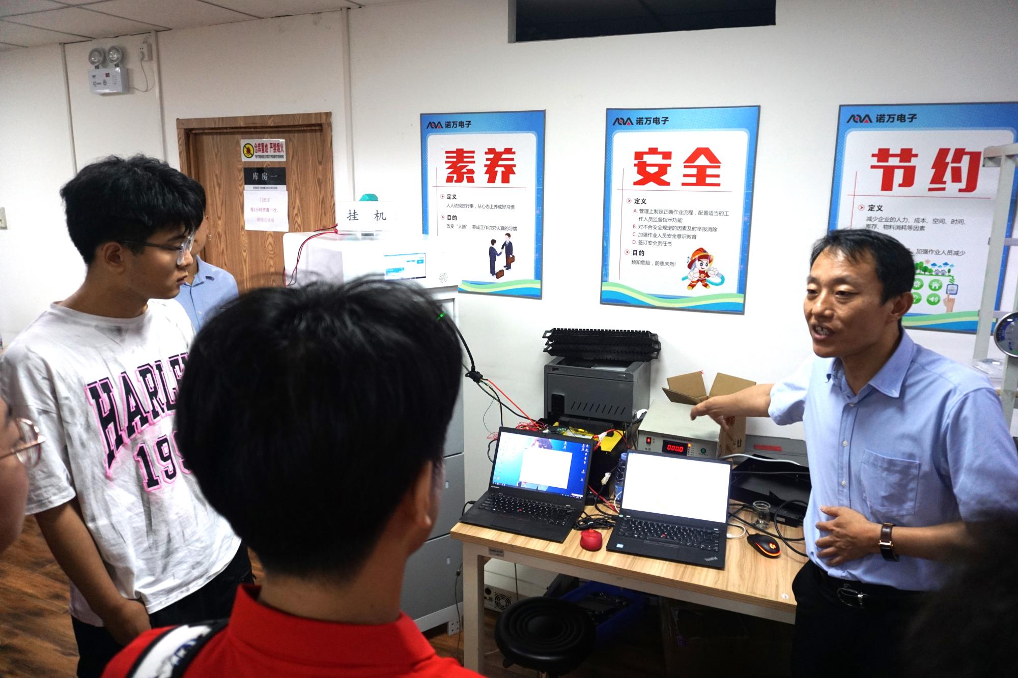 西安诺万电子科技有限公司总经理——2003届西电校友侯雷对学弟学妹们的到来表示热烈欢迎,并对企业的基本情况和应用技术进行详细介绍,带领实践队员参观研发产品,现场讲解电池管理系统的研发制作和产品应用,队员们切实体会到了新能源电池管理系统对储能、机器人、车辆应用、军事应用等多方面的重要作用。侯雷结合自己在西电的经历体会,耐心接受队员们的采访并对学弟学妹们提出了许多切实有效的建议,深化了队员们对母校的爱校荣校之情和强校建校之力。