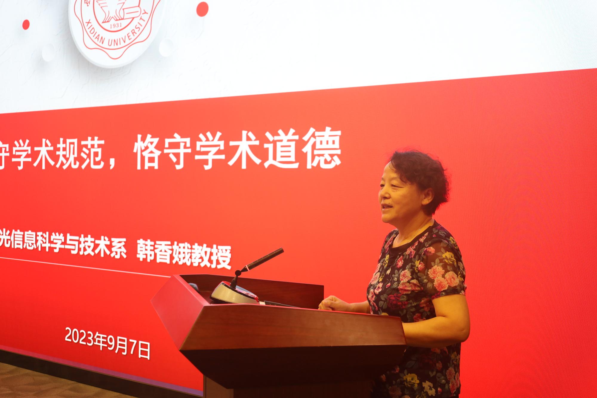 随后,魏兵向新生介绍了研究生培养情况及要求,希望新生同学能够迅速完成角色转变,尽早适应研究生生活。导师代表韩香娥教授向同学们开展了学术道德及学风建设培训,她介绍了学术道德相关要求以及学校相关文件规定,并以西电物理学科创始人王一平教授、物理实验奠基人胡昌璧教授的先进事迹,展现在科学研究中一丝不苟、刻苦钻研的精神,希望同学们能够向老一辈科学家学习,传承科学家精神、潜心科学研究。