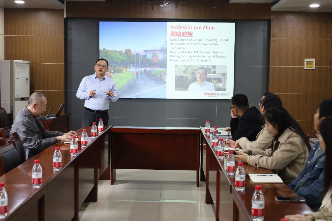 魏兵对Jun Zhou教授的来访表示热烈欢迎,并希望通过此次交流,能对青年教师研究生培养、研究生国际交流等方面开拓新的思路。Jun Zhou教授以轻松有趣的方式介绍了澳大利亚及格里菲斯大学的高等教育培养体系,涉及学科建设、办学特色、专业设置、课程体系、代表性成果、奖助学金等方面,并重点介绍了格里菲斯大学的硕士/博士申请、联培的基本要求。他表示非常欢迎感兴趣的同学申请访学与联培,进一步加强双方高校的交流与合作。
