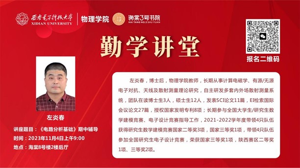 (通讯员 任浩楠)为帮助学生巩固知识点,提高学习效率,助力期中考试,11月4日,PA捕鱼官方网站联合海棠3号书院和海棠4号书院开展考前辅导讲座,邀请PA捕鱼官方网站李艳辉老师和左炎春老师分别为大二学子进行《大学物理II》《电路分析基础》的课程辅导,系统梳理知识点,讲解重点难点。共计150余名学生参与活动。