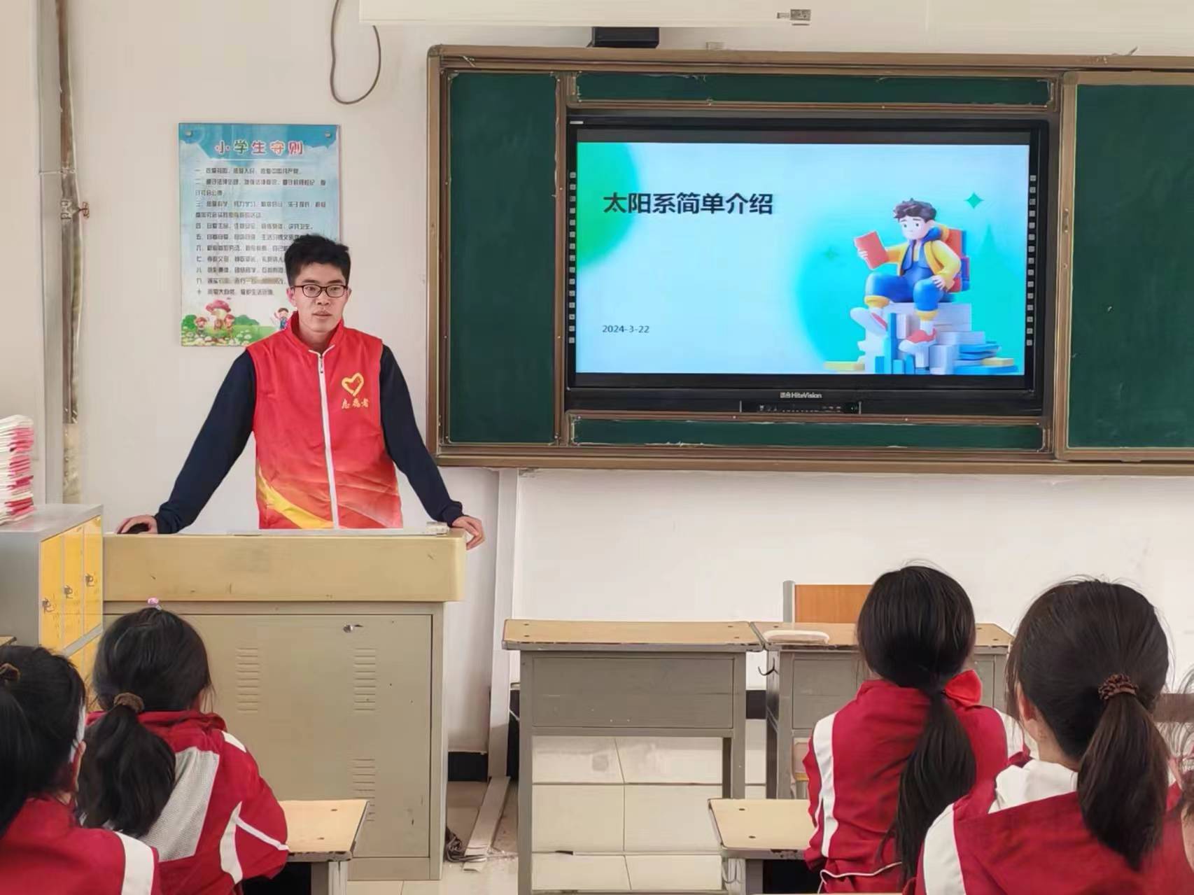 正值春暖花开,校园里洋溢着春的气息。本次科普活动中志愿者们分享了三个主题,分别是太阳系的介绍、信息传播小科普和食物在人身体内的旅行。第一个主题课程中,志愿者们从太阳系的诞生、形成及演化出发,结合太阳系的图片、视频进行生动讲解,并为小学生们介绍了太阳系内八大行星、其他卫星和天体的特征。神秘且遥远的宇宙激发了同学们对星空的无限遐想。