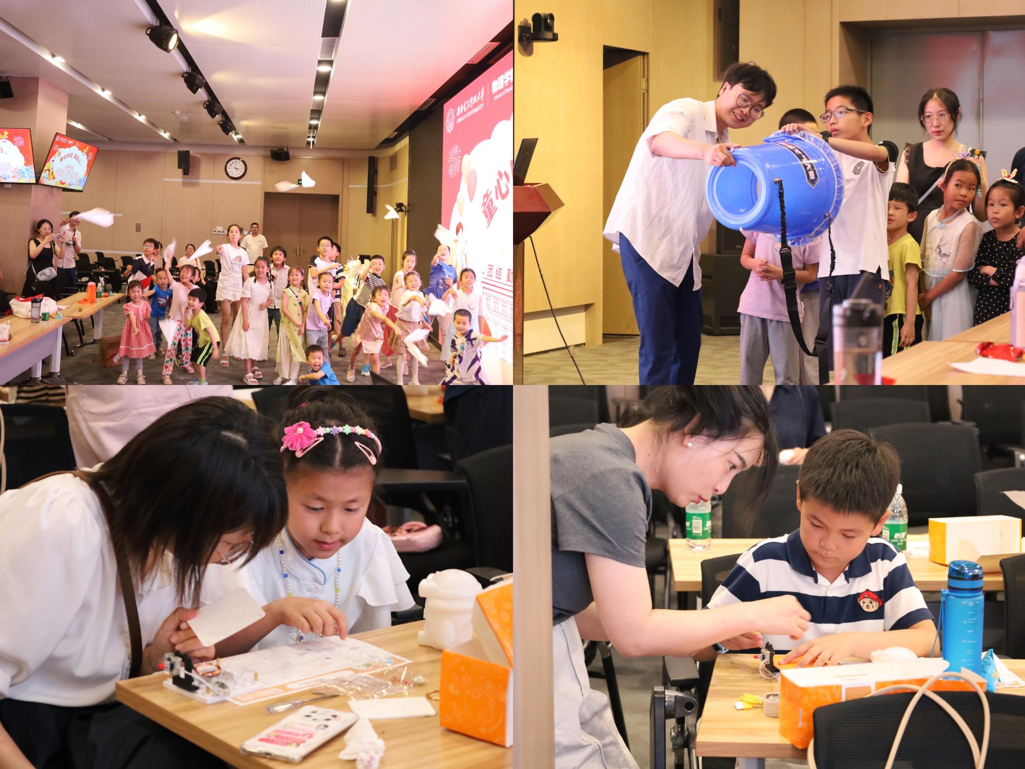 张琳代表学院向参加活动的小朋友们致以节日的祝贺,感谢家长们对学院活动的支持。随后,老师向小朋友们讲解了伯努利原理,并通过纸飞机展示了伯努利原理在生活中的应用场景,用空气炮展示了与空气相关的神奇原理。随后向大家讲解了电磁感应原理,由家长带领小朋友们共同动手,制作无线充电感应灯,在大家的共同努力下,一盏盏灯纷纷被点亮。通过此次活动,孩子们不仅锻炼了动手能力,也交到了新朋友,活动现场充满了和谐与欢乐的氛围,大朋友们脸上也洋溢着灿烂的笑容,被孩子们的天真与童心感染着,一起享受着节日的快乐与幸福。