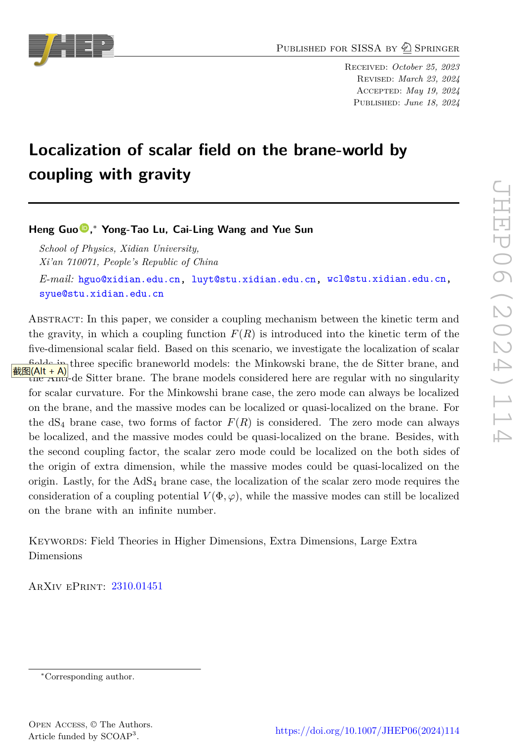 (通讯员:郭恒)近日,PA捕鱼官方网站郭恒副教授在高维量子场论的研究中取得新进展,并在物理类顶级期刊Journal of High Energy Physics(中科院一区,JCR一区,Top期刊)发表了题目为“Localization of scalar field on the brane-world by coupling with gravity” 的学术论文。郭恒副教授为该论文的第一作者和通讯作者,PA捕鱼官方网站为论文的唯一单位。该研究是在国家自然科学基金、陕西省自然科学基金和学校基础学科建设经费的支持下完成的。